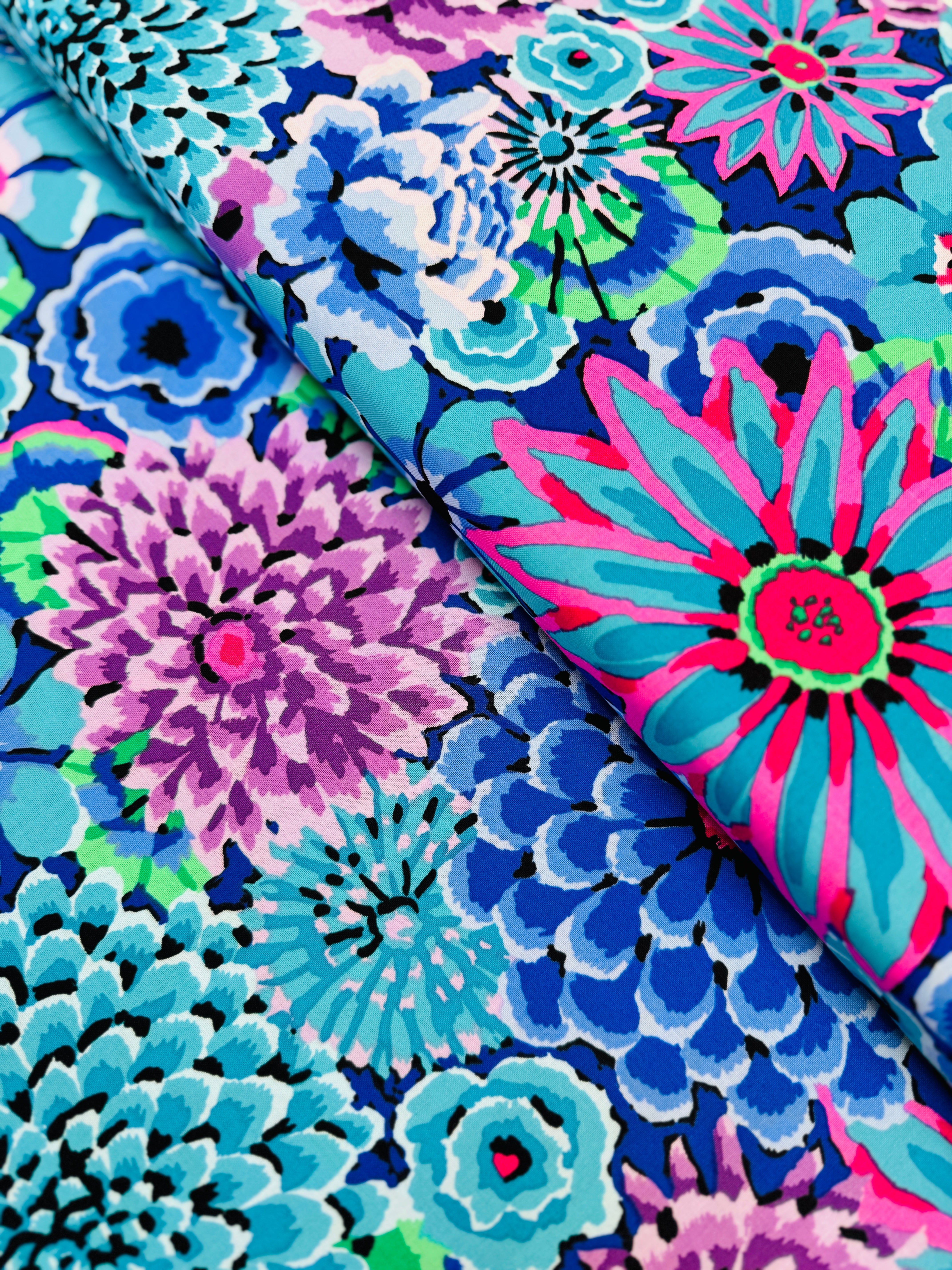 Enchanted Blue quilting cotton by Philip Jacobs for the Kaffe Fassett Collective – bold blue floral print on cotton fabric