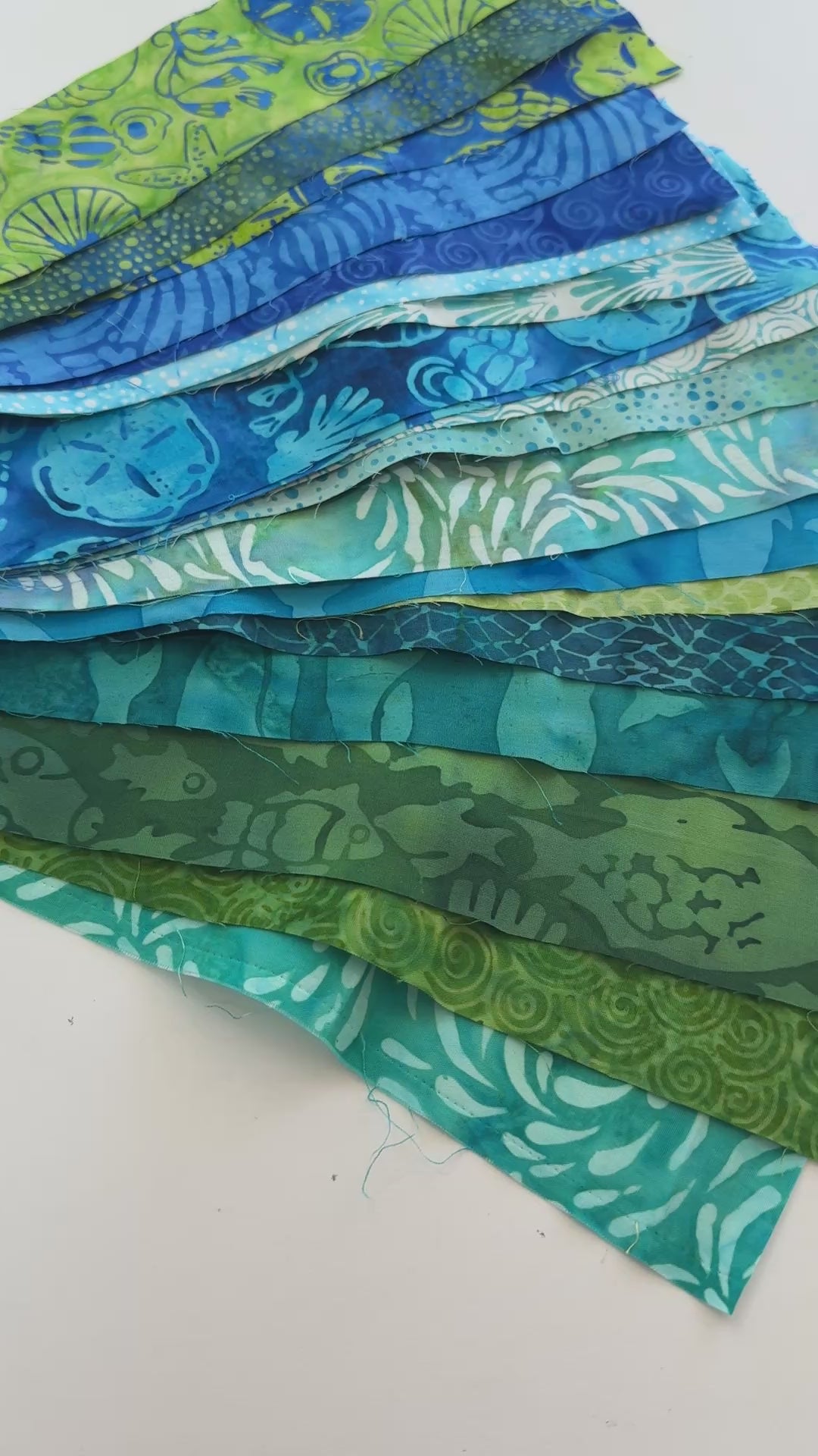 Bring fresh ocean color to your next project with this Assorted Ocean Batik Scrap Strip Bundle curated from artisan-dyed fabrics by Kathy Engle for Island Batik. This beautiful assortment features stunning batik prints in shades of blue, teal, turquoise, and green is perfect for coastal quilts, summer sewing, and batik-inspired designs.