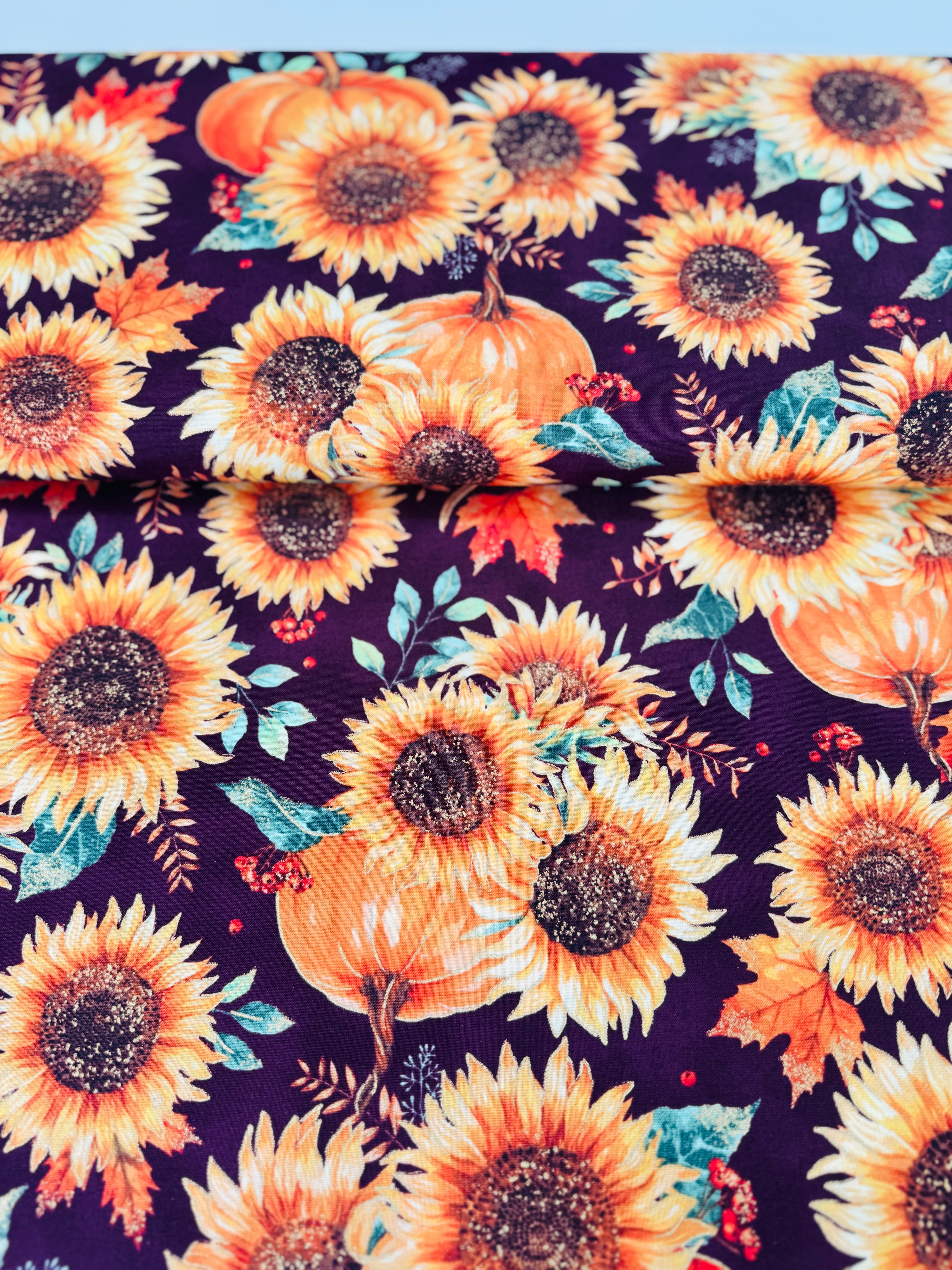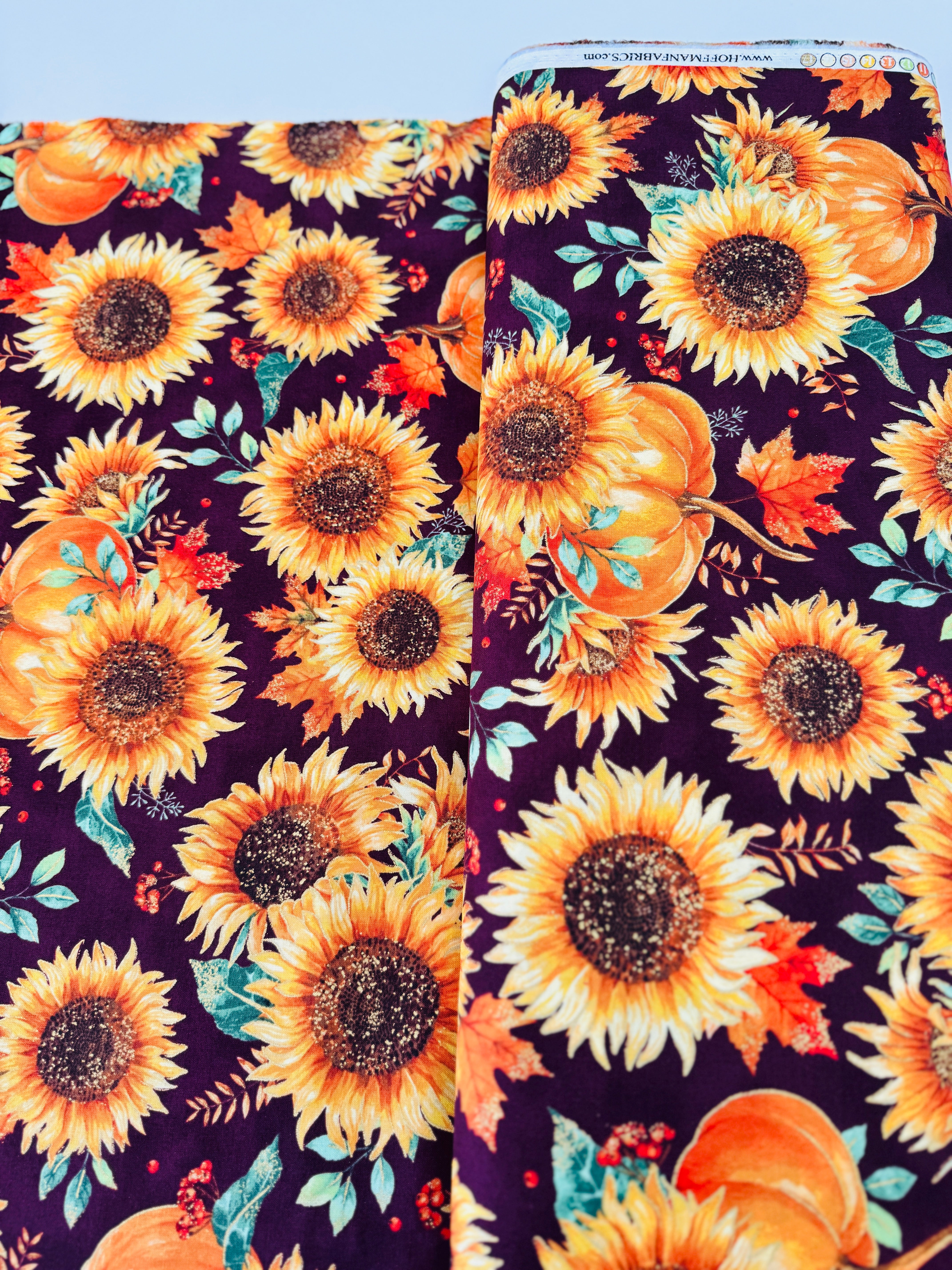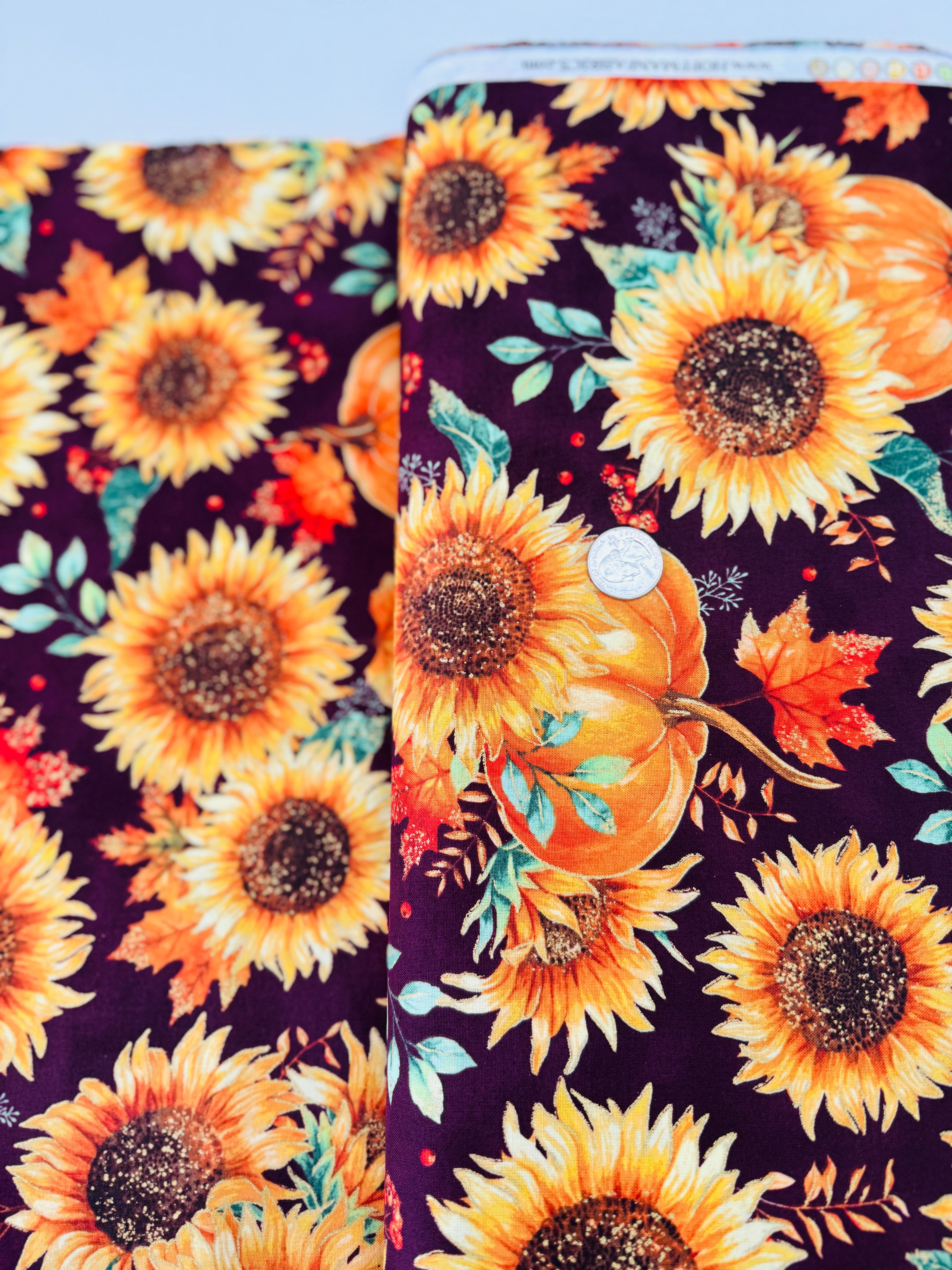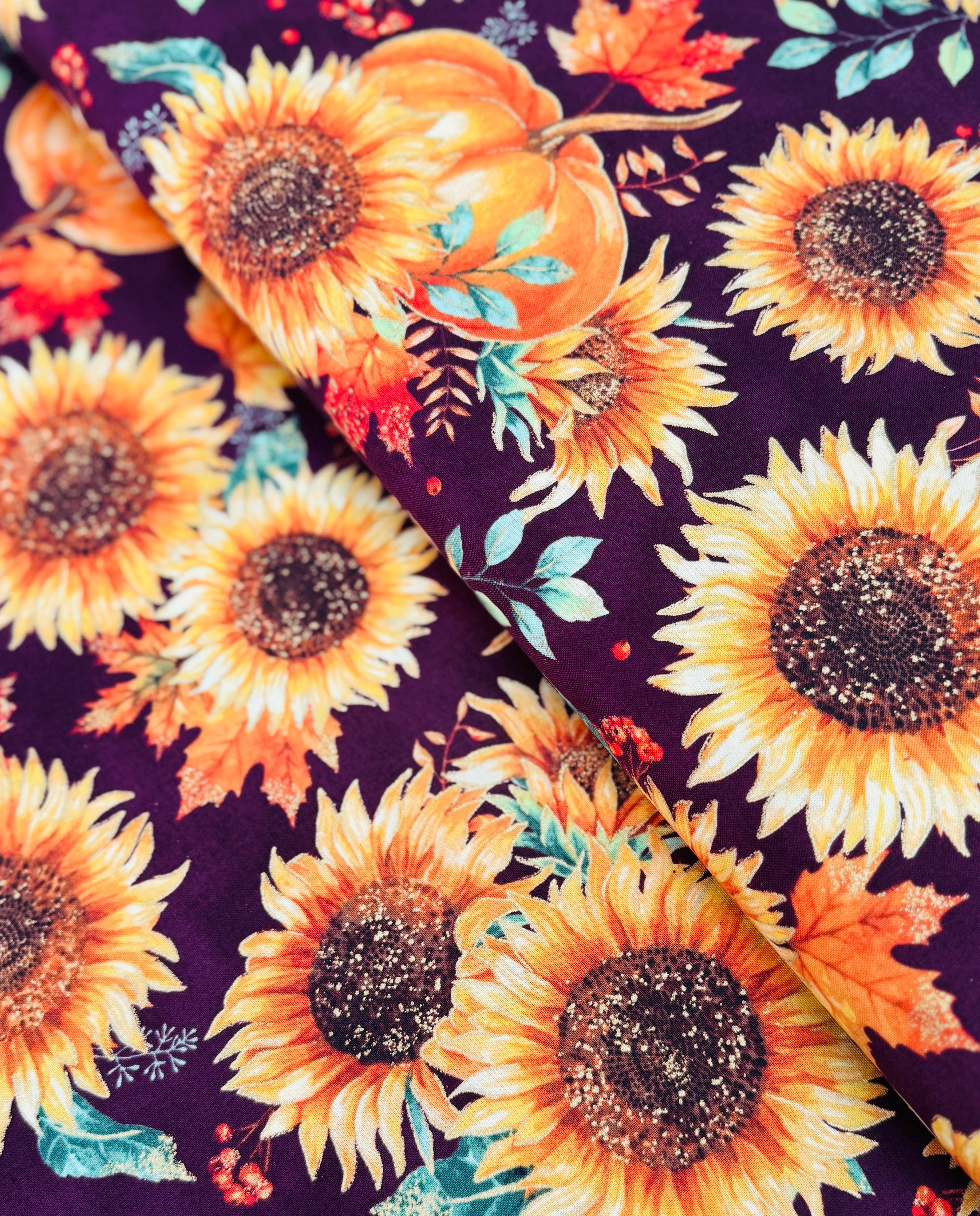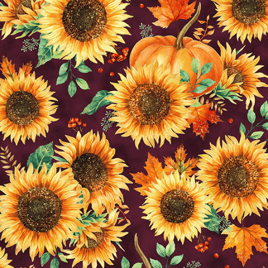 Celebrate the cozy beauty of the season with Fall is in the Air – Sunflowers Mulberry/Gold Metallic by Hoffman Fabrics. This luxurious quilting cotton features radiant sunflowers accented with shimmering gold metallic on a bold mulberry background. A perfect choice for fall quilts, home accents, and elegant autumn projects.