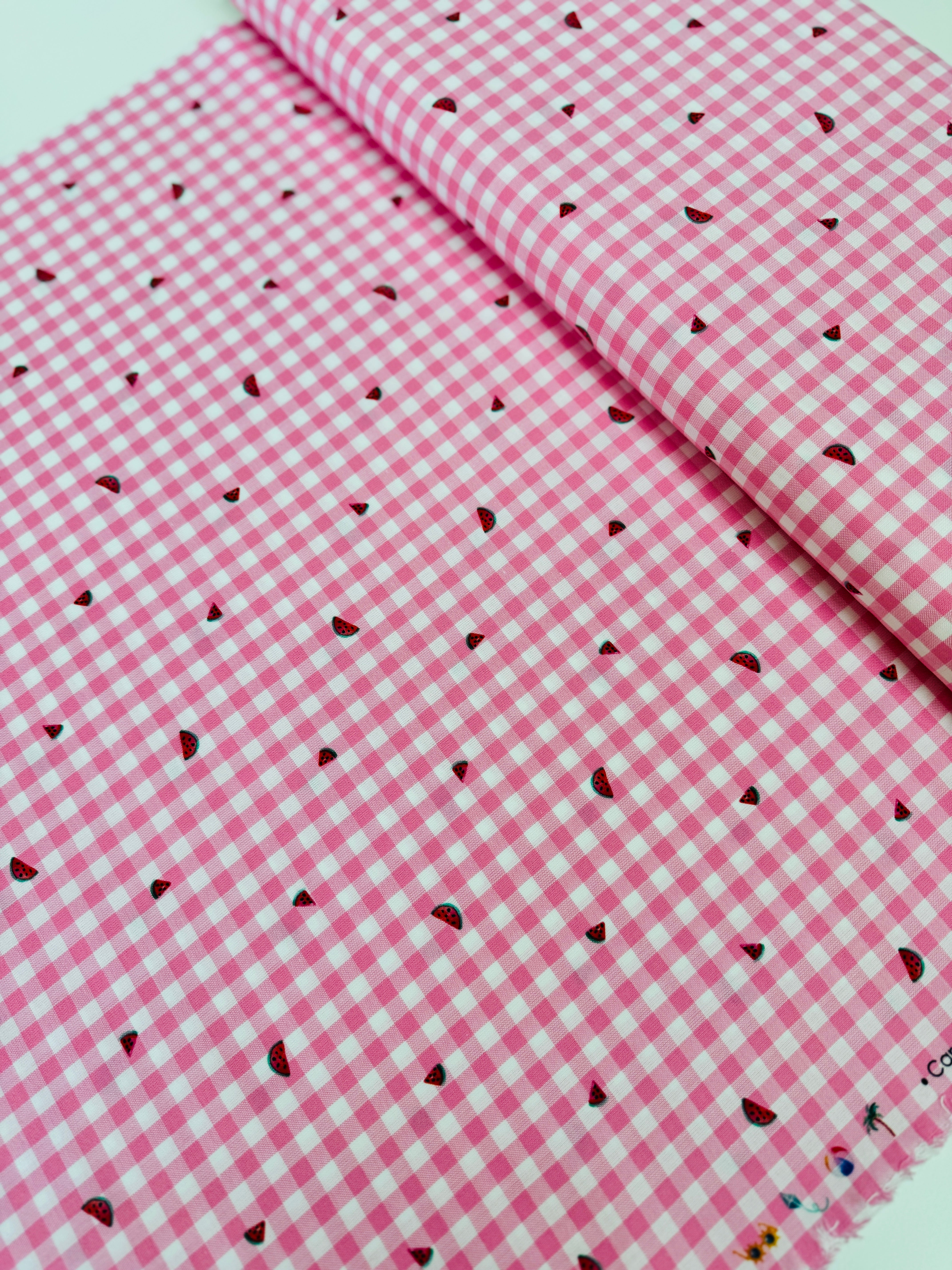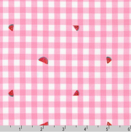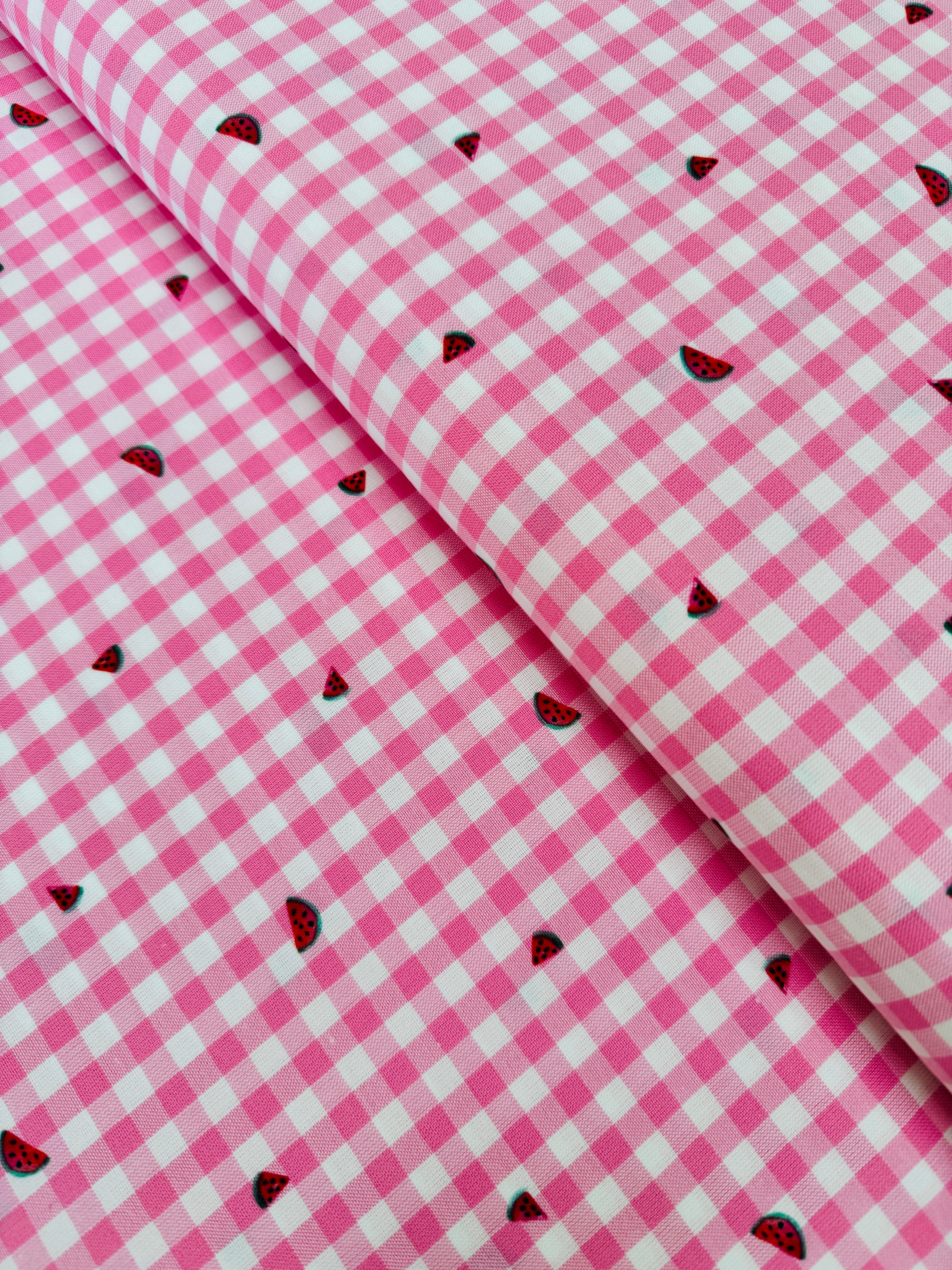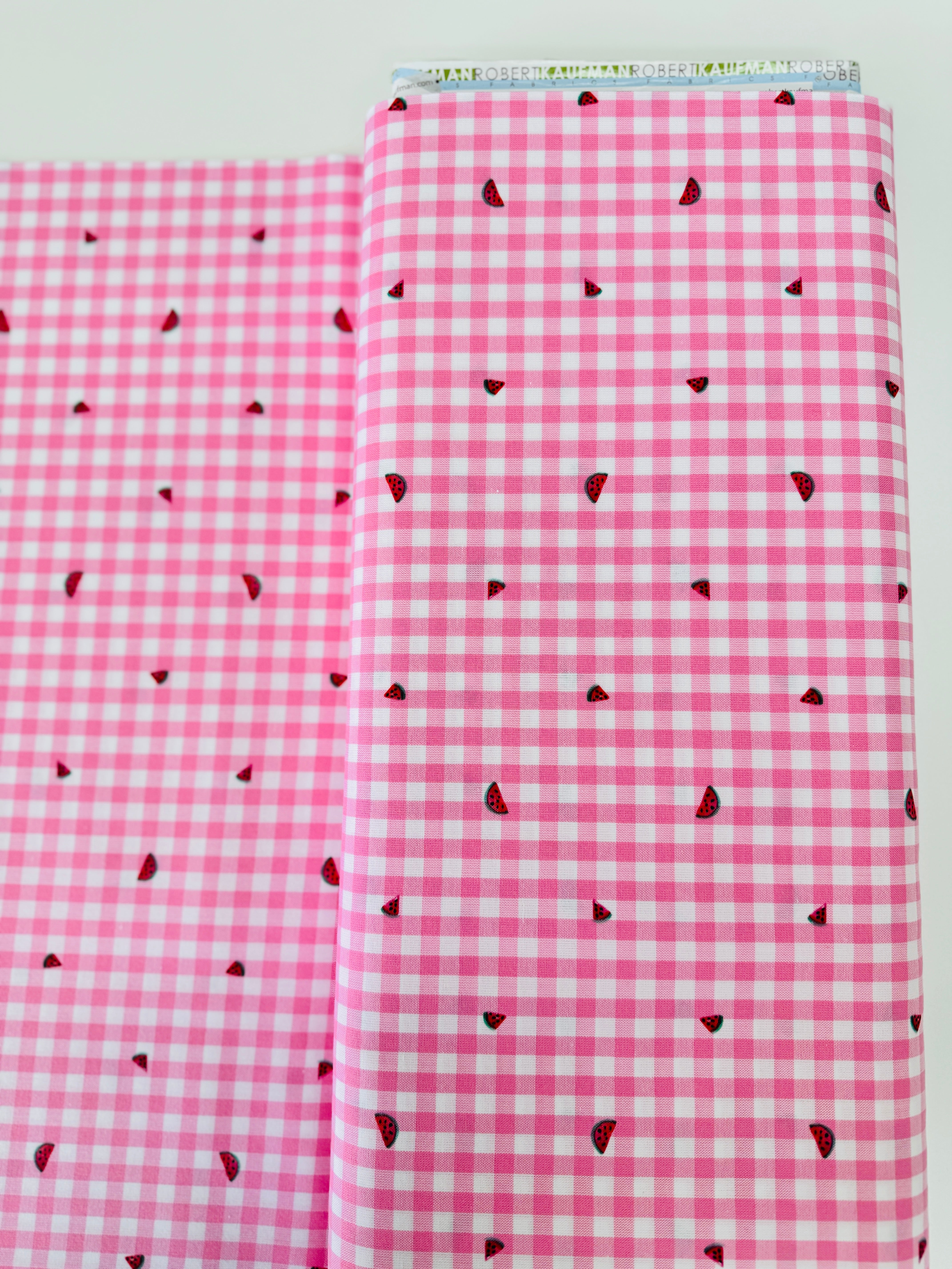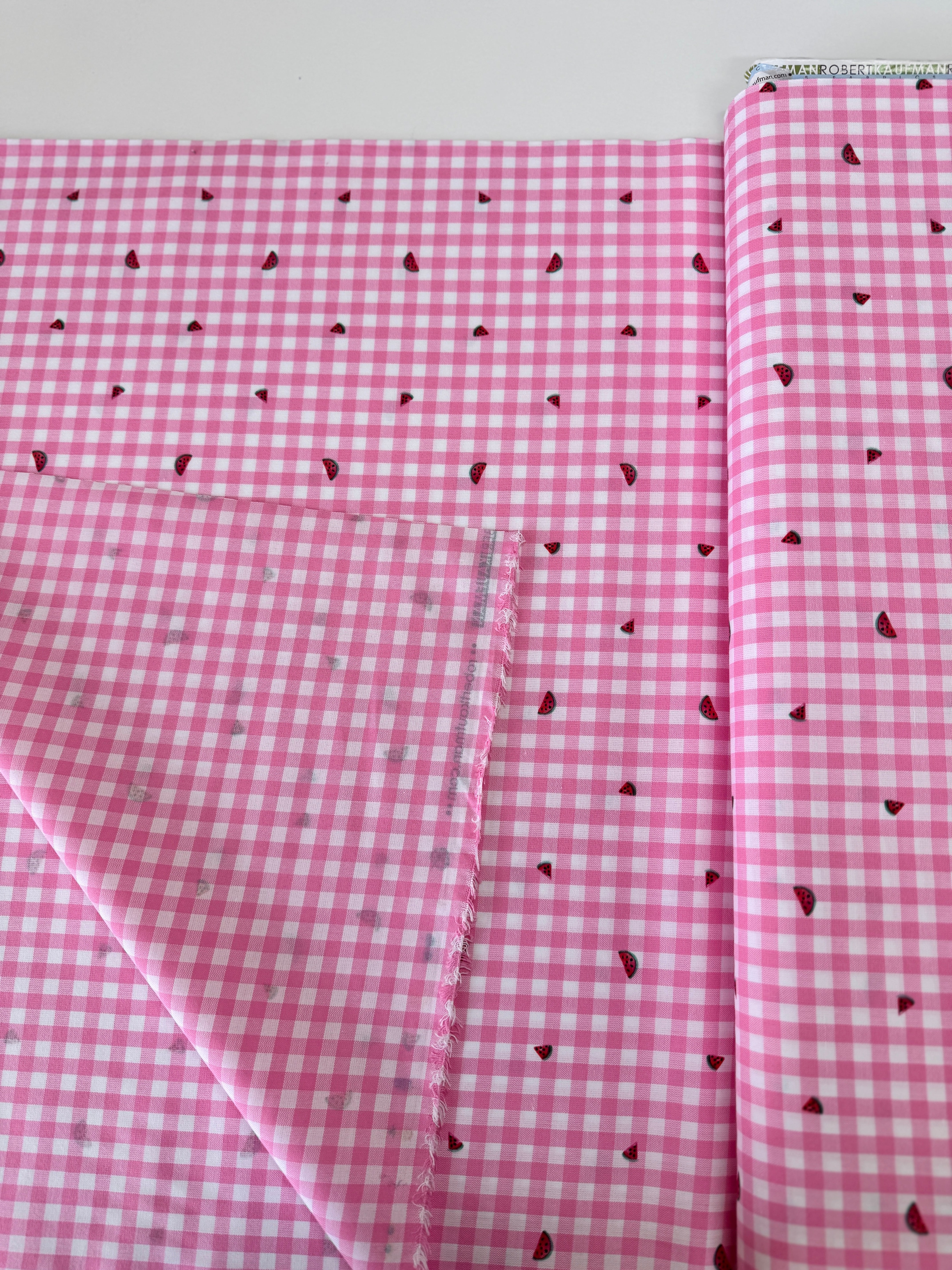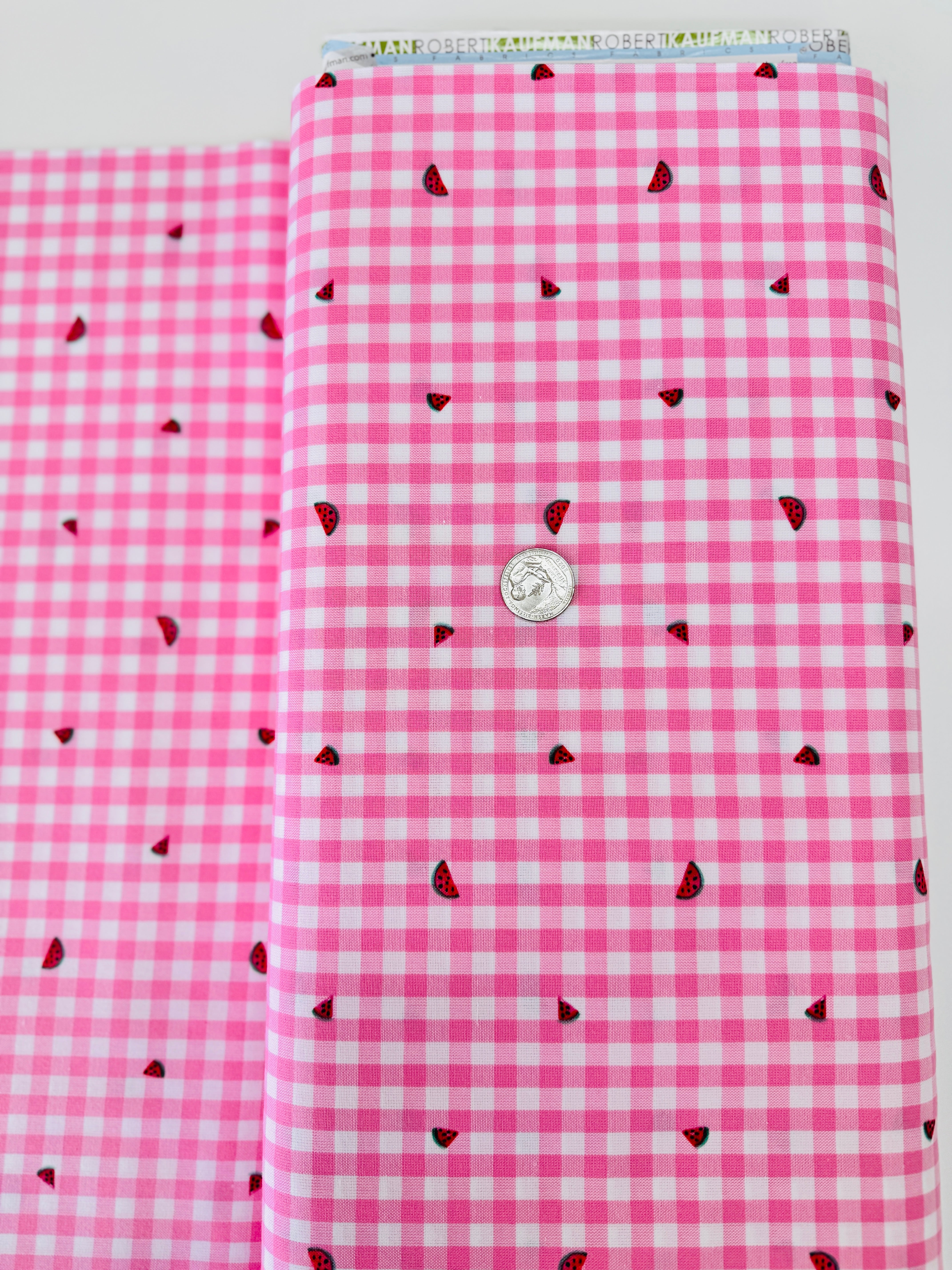Make a splash with Watermelons Candy Pink, part of the Carolina Shore Prints line by Robert Kaufman Fabrics. This bright, 100% cotton gingham features a playful overprint of juicy watermelon slices atop a candy-pink, yarn-dyed check is perfect for quilts, summer apparel, picnic linens, and cheerful crafts.