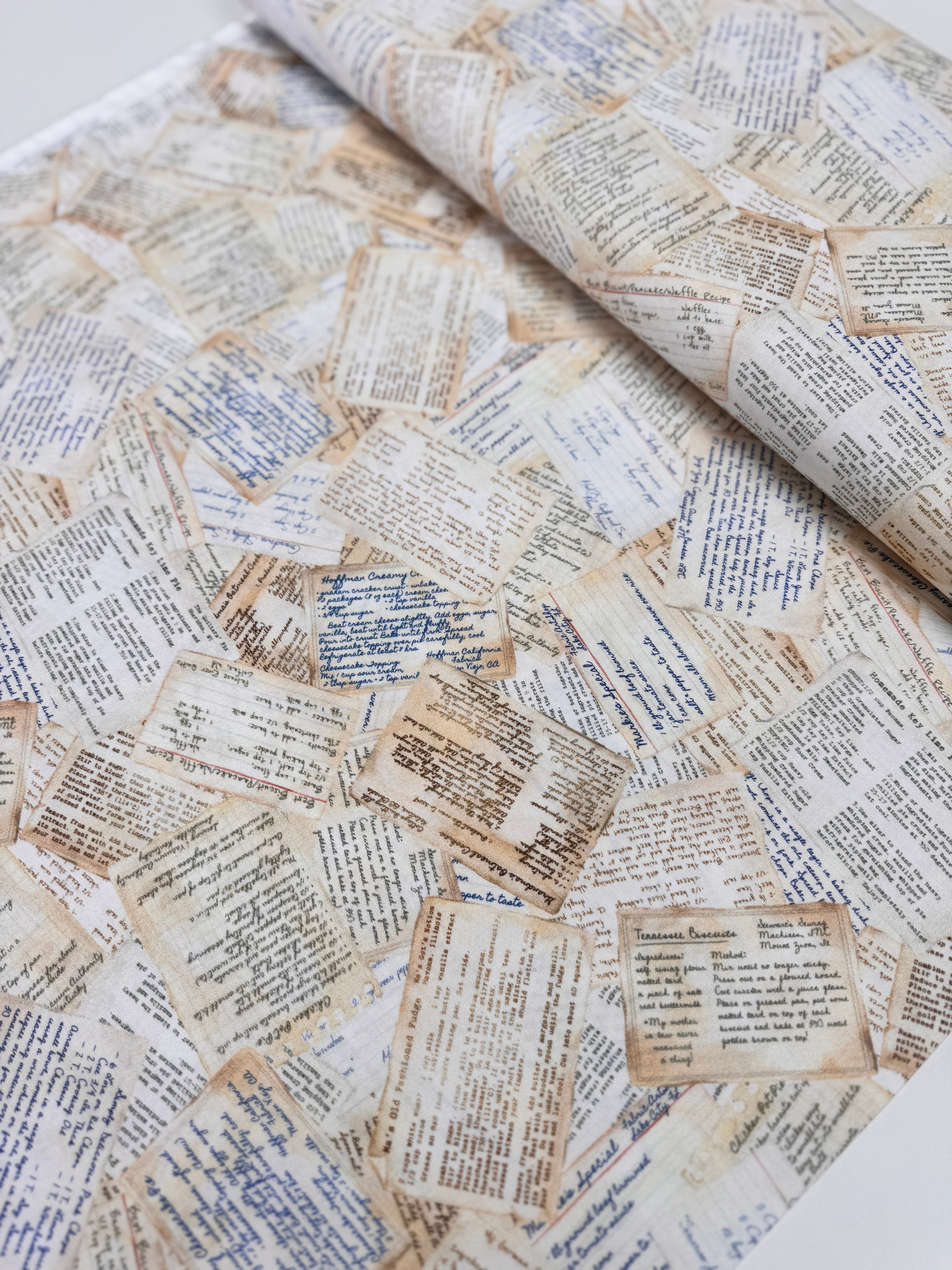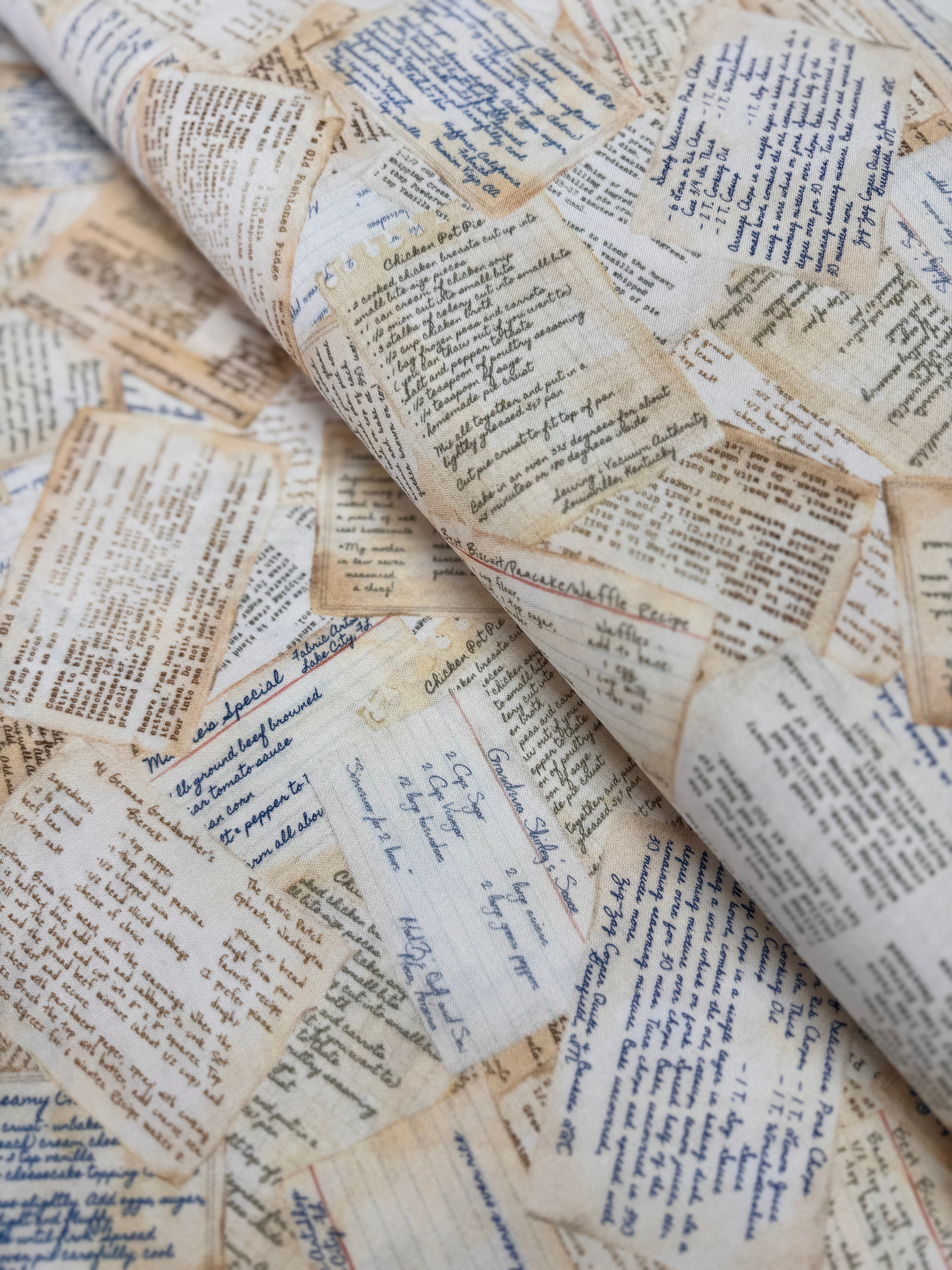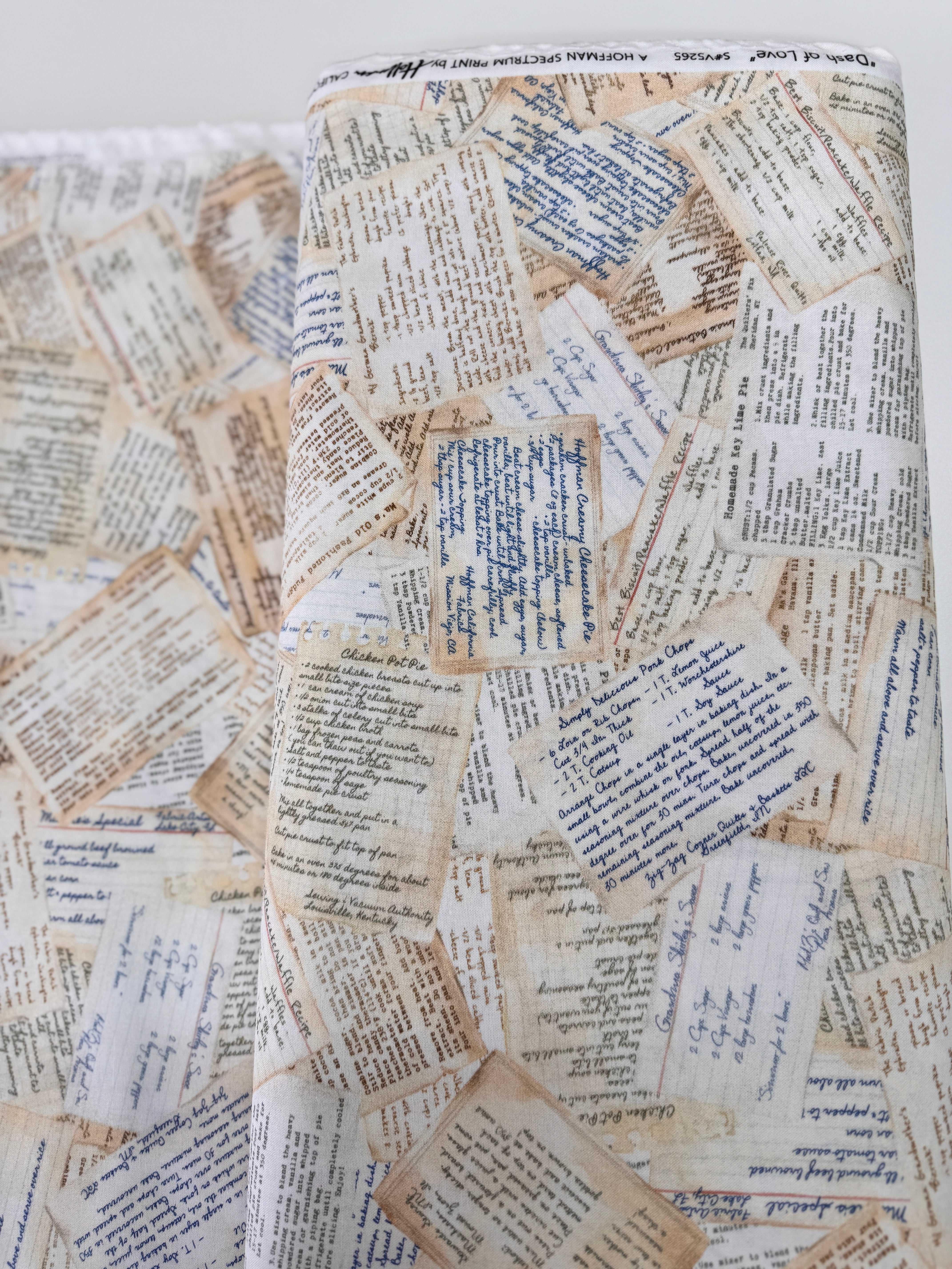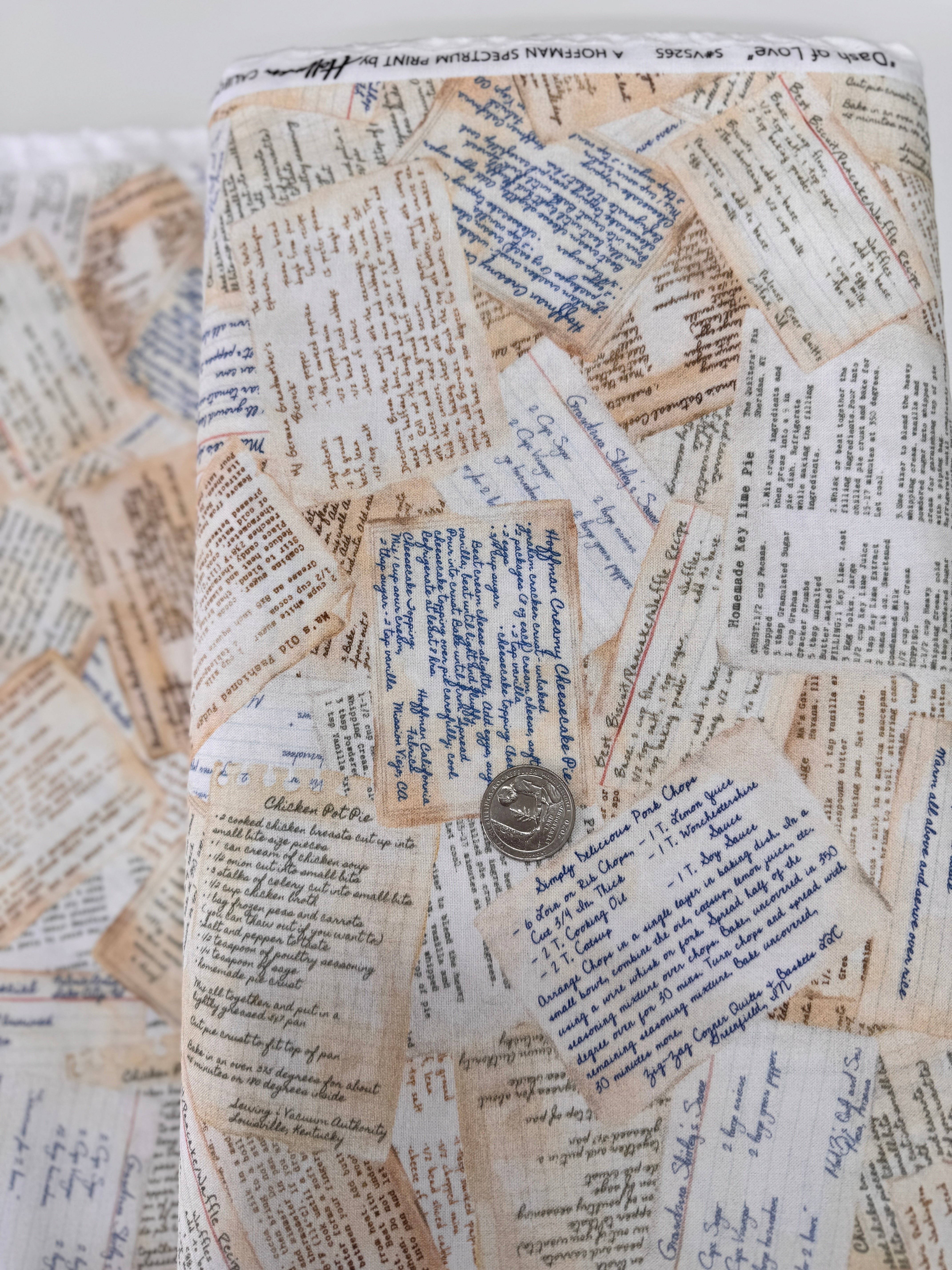 Inspire culinary creativity with Dash Of Love – Recipe Cards in Antique Beige, a Spectrum Digital Print by Hoffman Fabrics. This charming cotton quilting fabric showcases vintage-style recipe cards in sepia tones is perfect for kitchen-themed quilts, aprons, tote bags, and cooking corner décor.