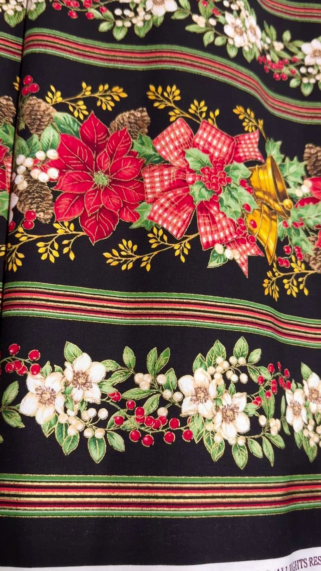 Deck The Halls - Christmas Poinsettia 11 Stripe Black Metallic Yardage