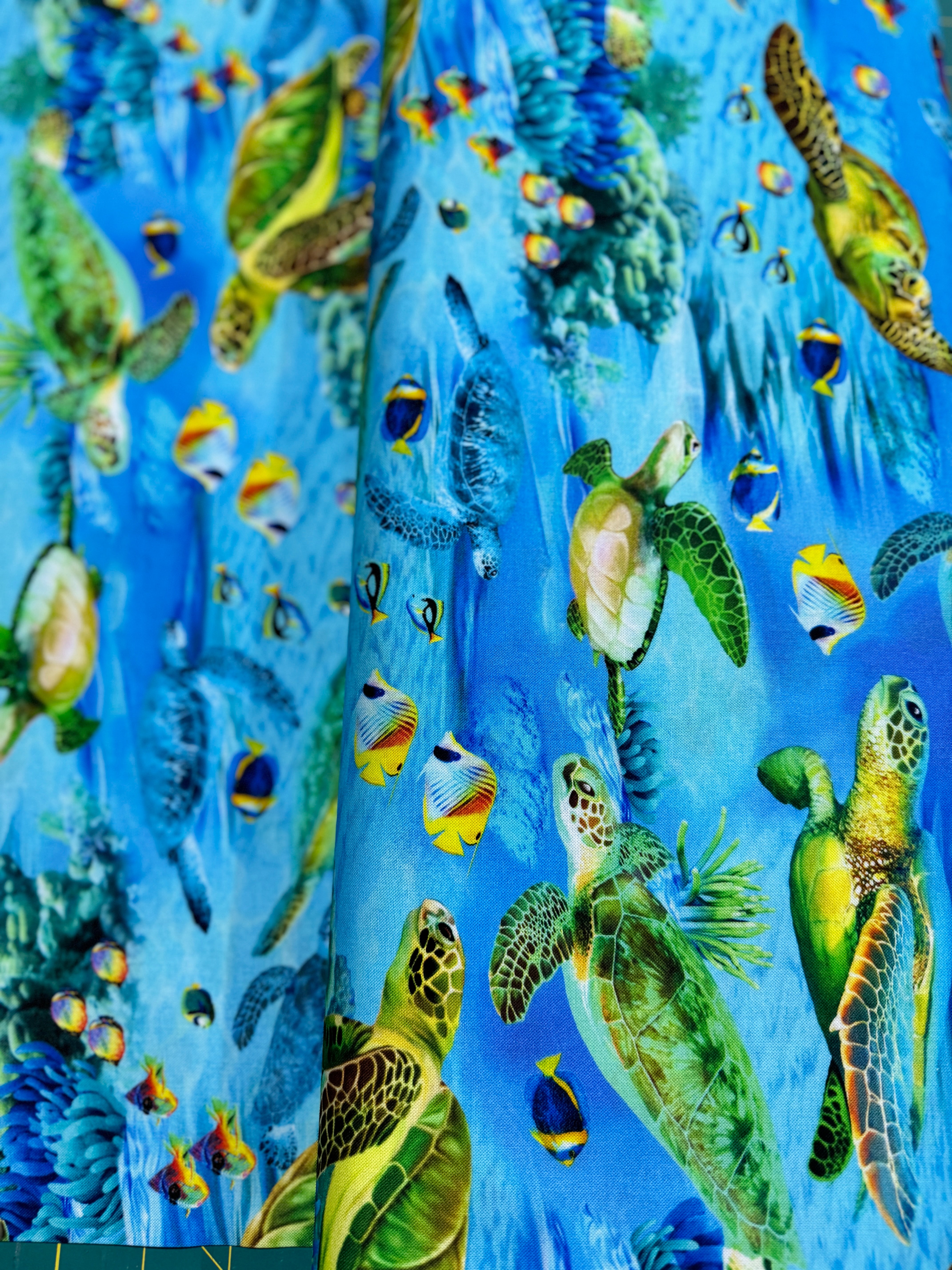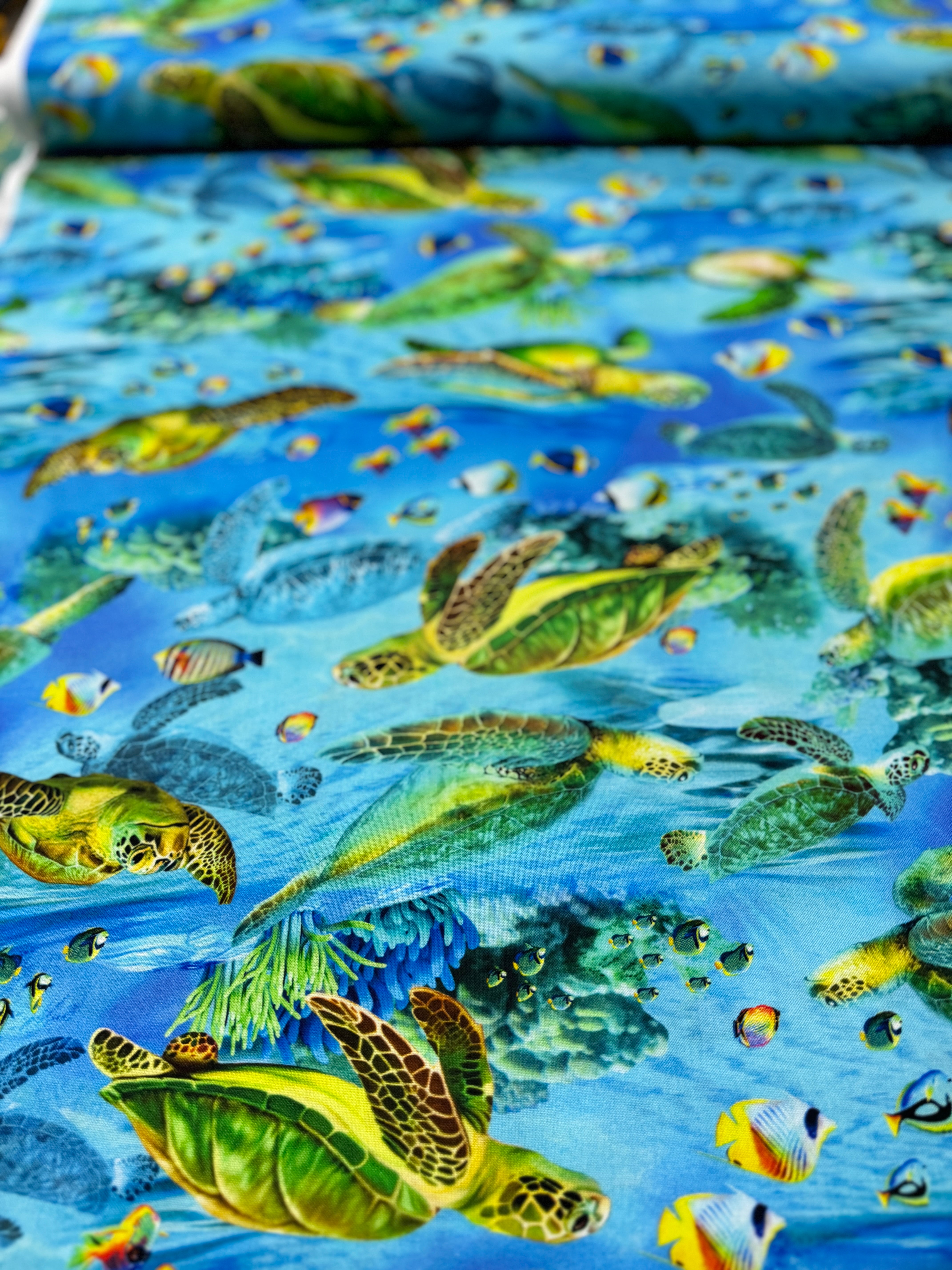 Deep Blue Sea - Realistic Sea Turtle And Sea Life Fabric by Michael Searle for Timeless Treasures