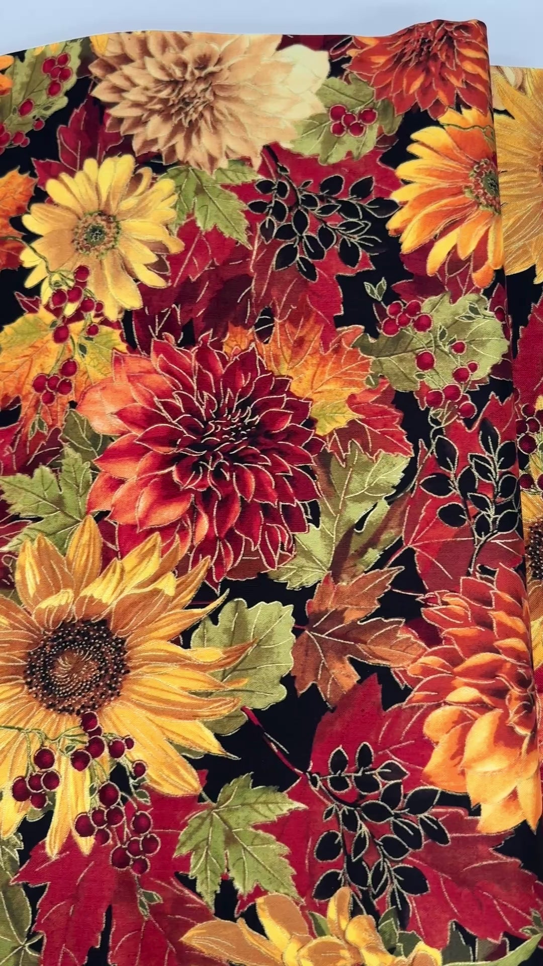 Harvest Flowers – Metallic from the Fall Glory collection by Timeless Treasures brings the colors of autumn to life with vibrant fall florals and elegant metallic gold accents. This high-quality 100% cotton fabric is perfect for creating Thanksgiving quilts, fall home décor, or warm seasonal accessories.