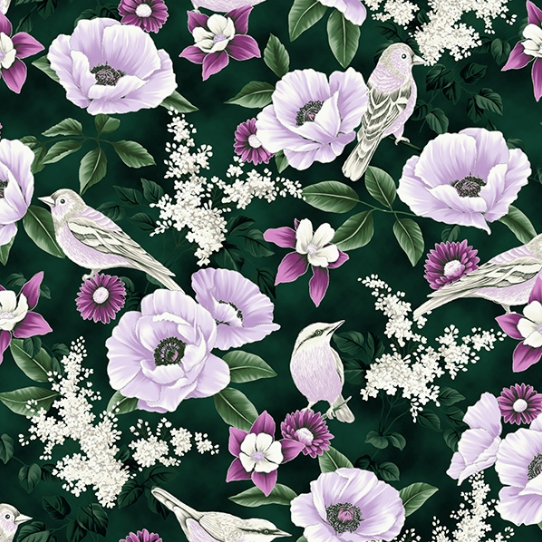 Fly Freely - Birds And Florals Deep Emerald/Silver Metallic Fabric by Hoffman Fabrics