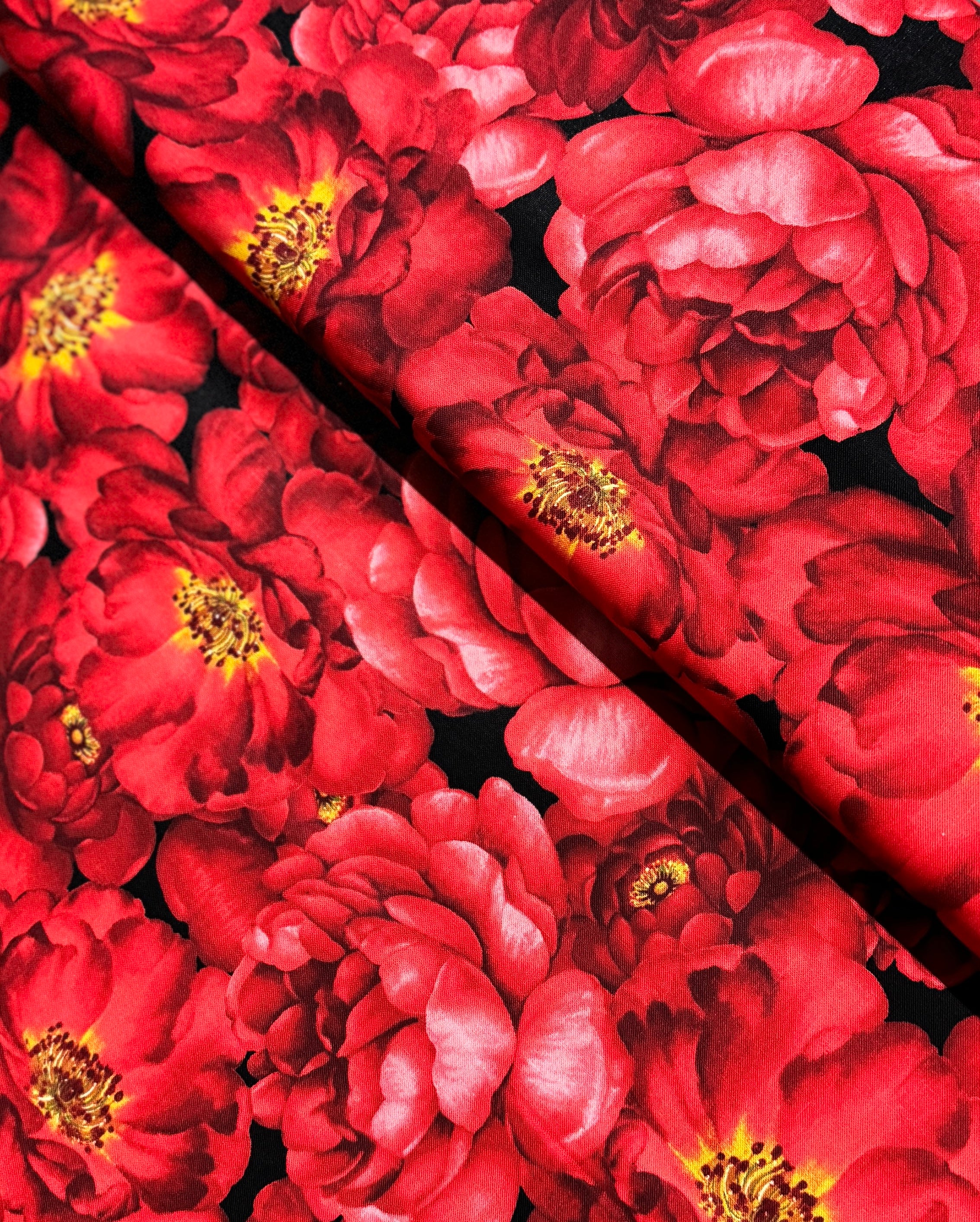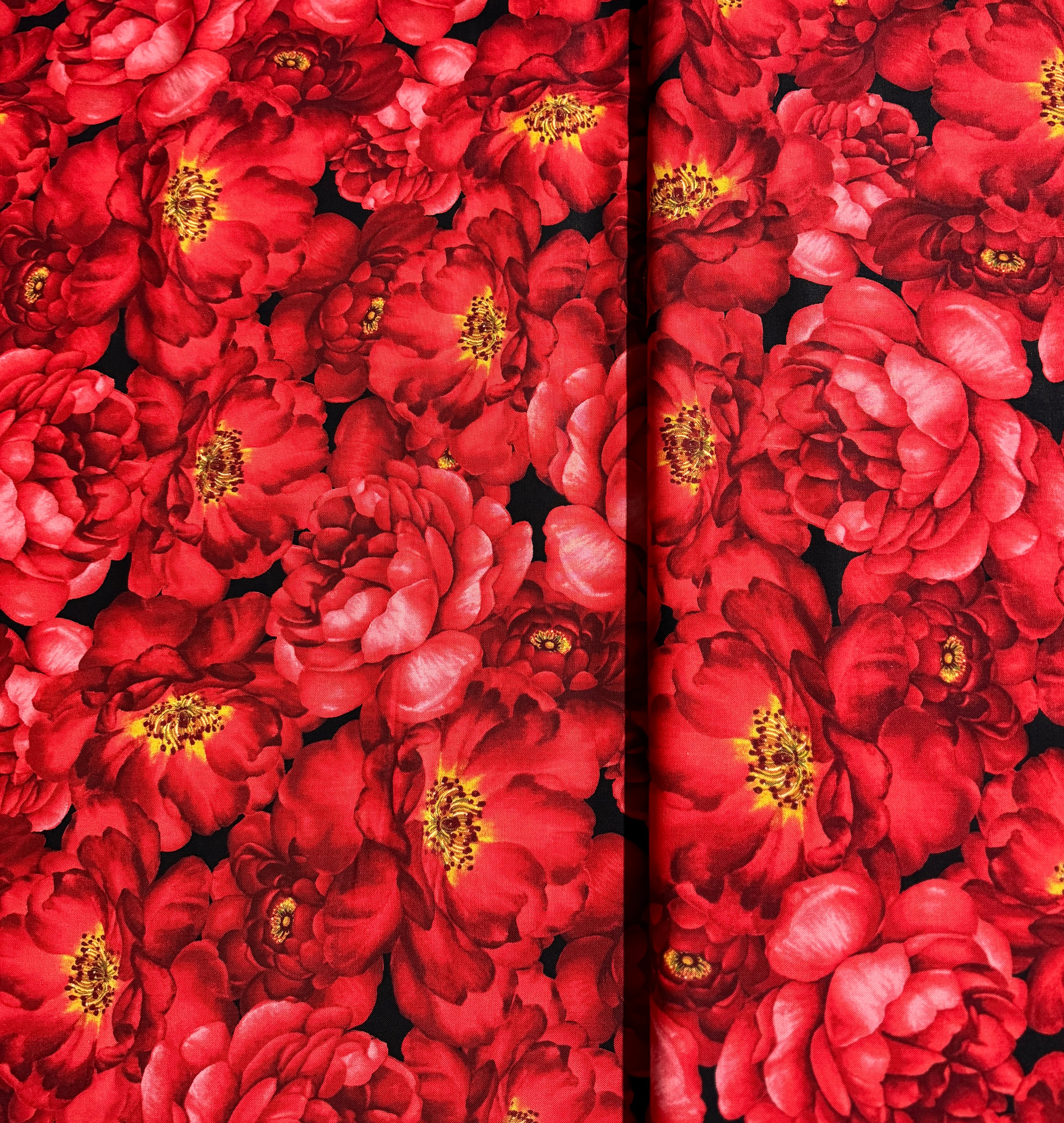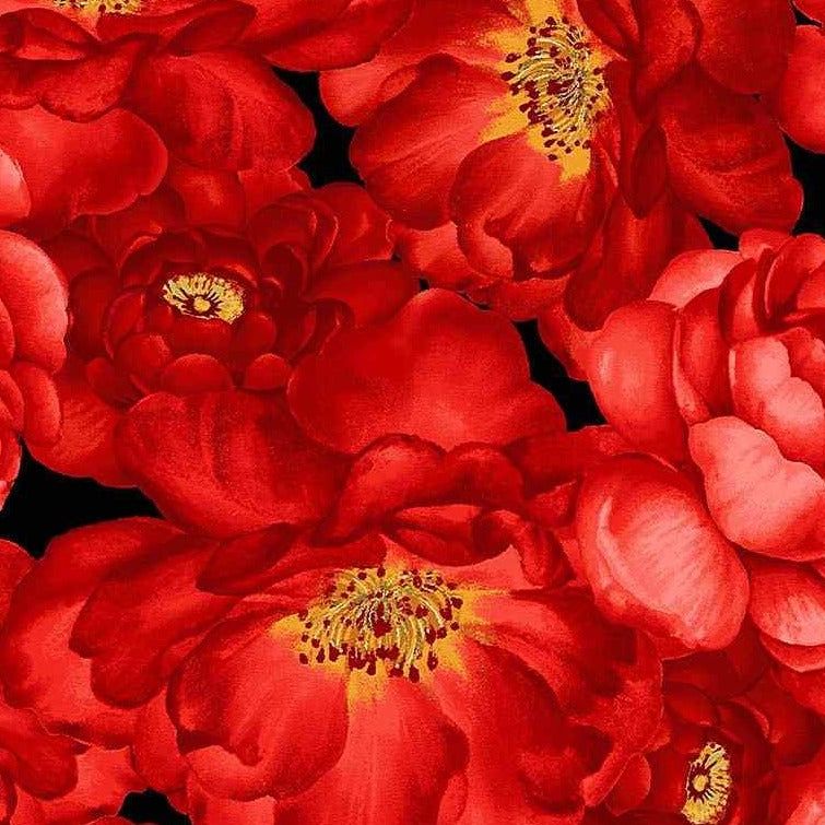Garden Rose - Packed Large Red Roses on Black Yardage