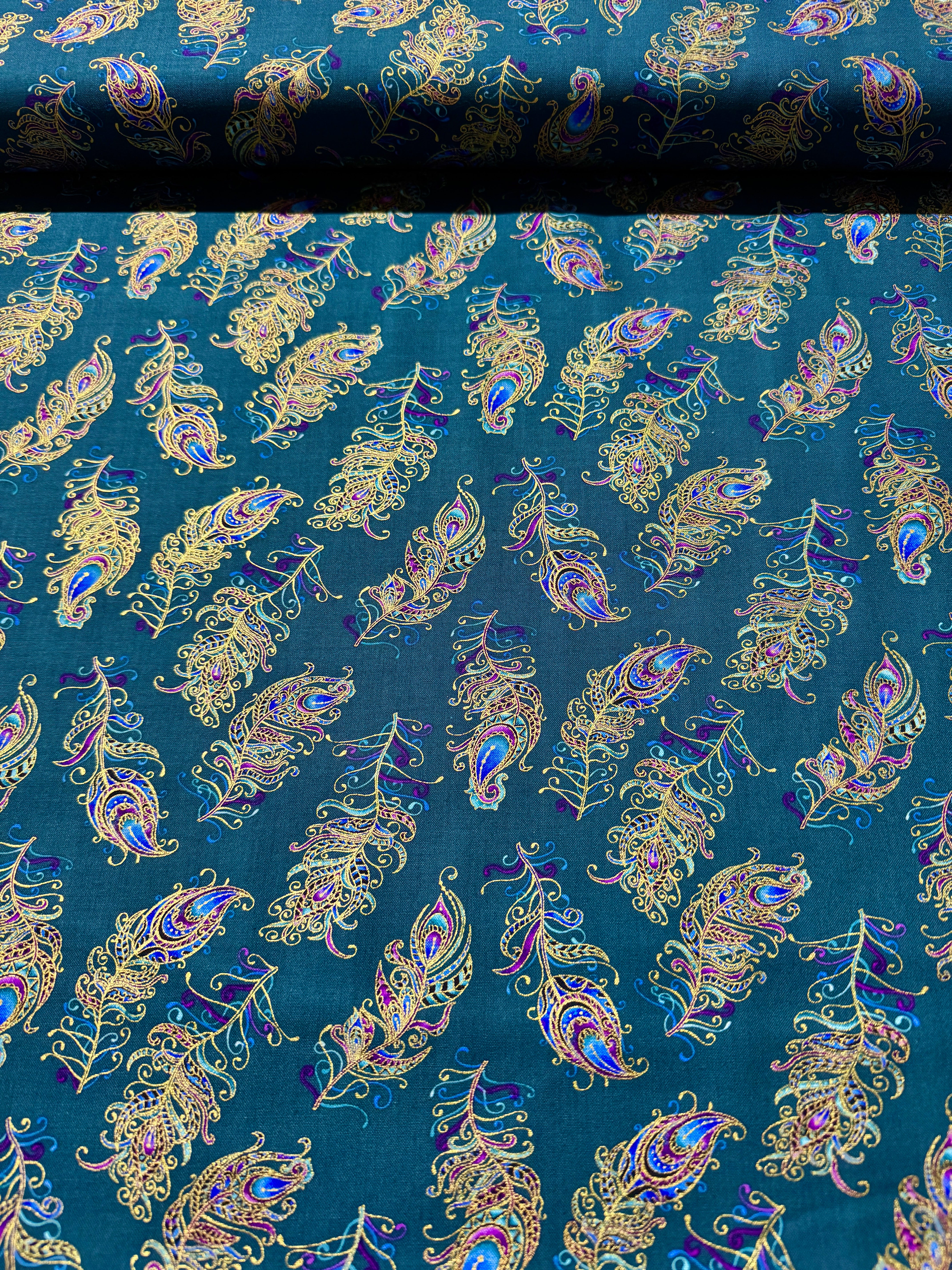 Peacock Flourish - Floating Feathers Small Dark Teal Multi Yardage