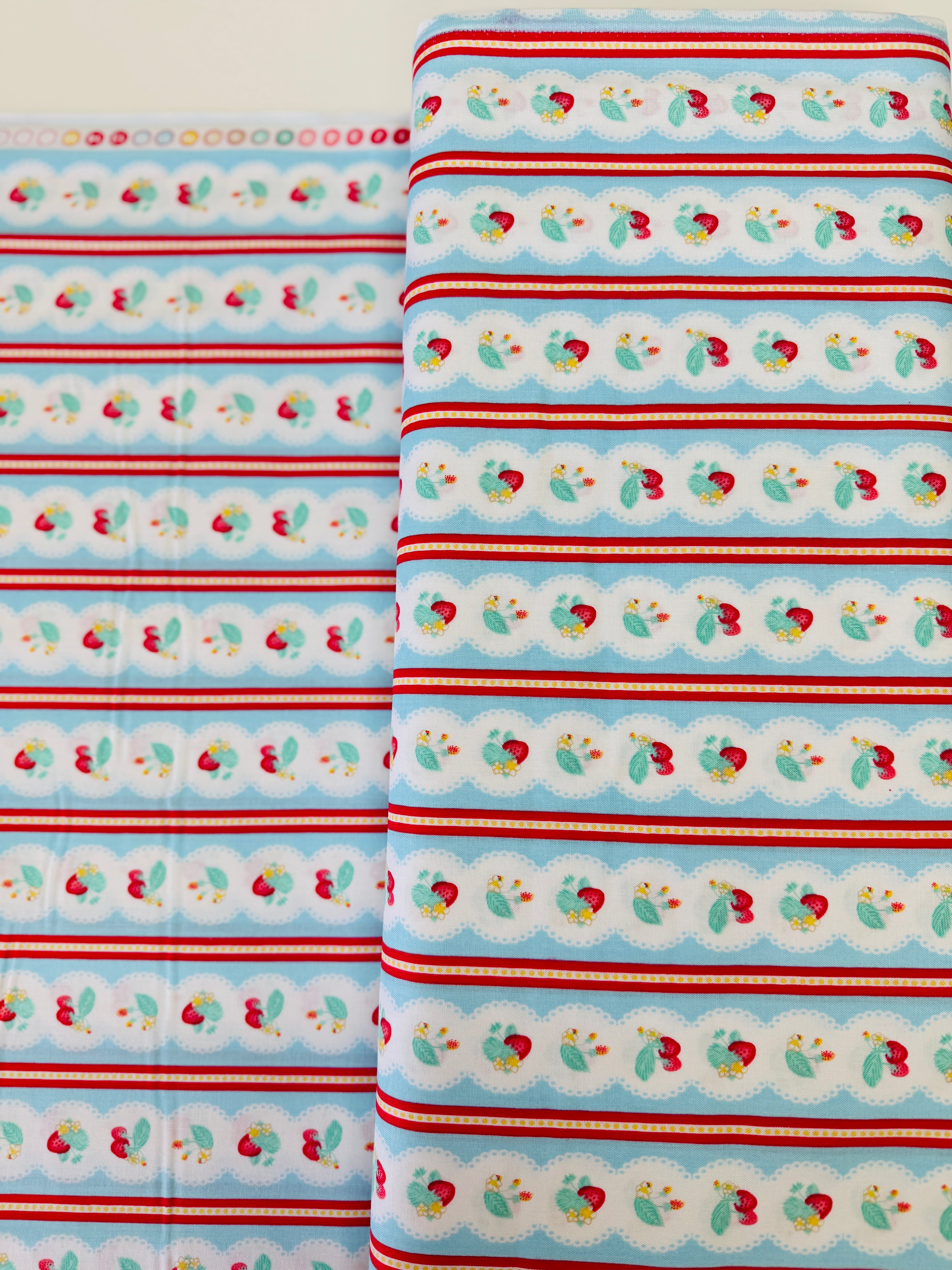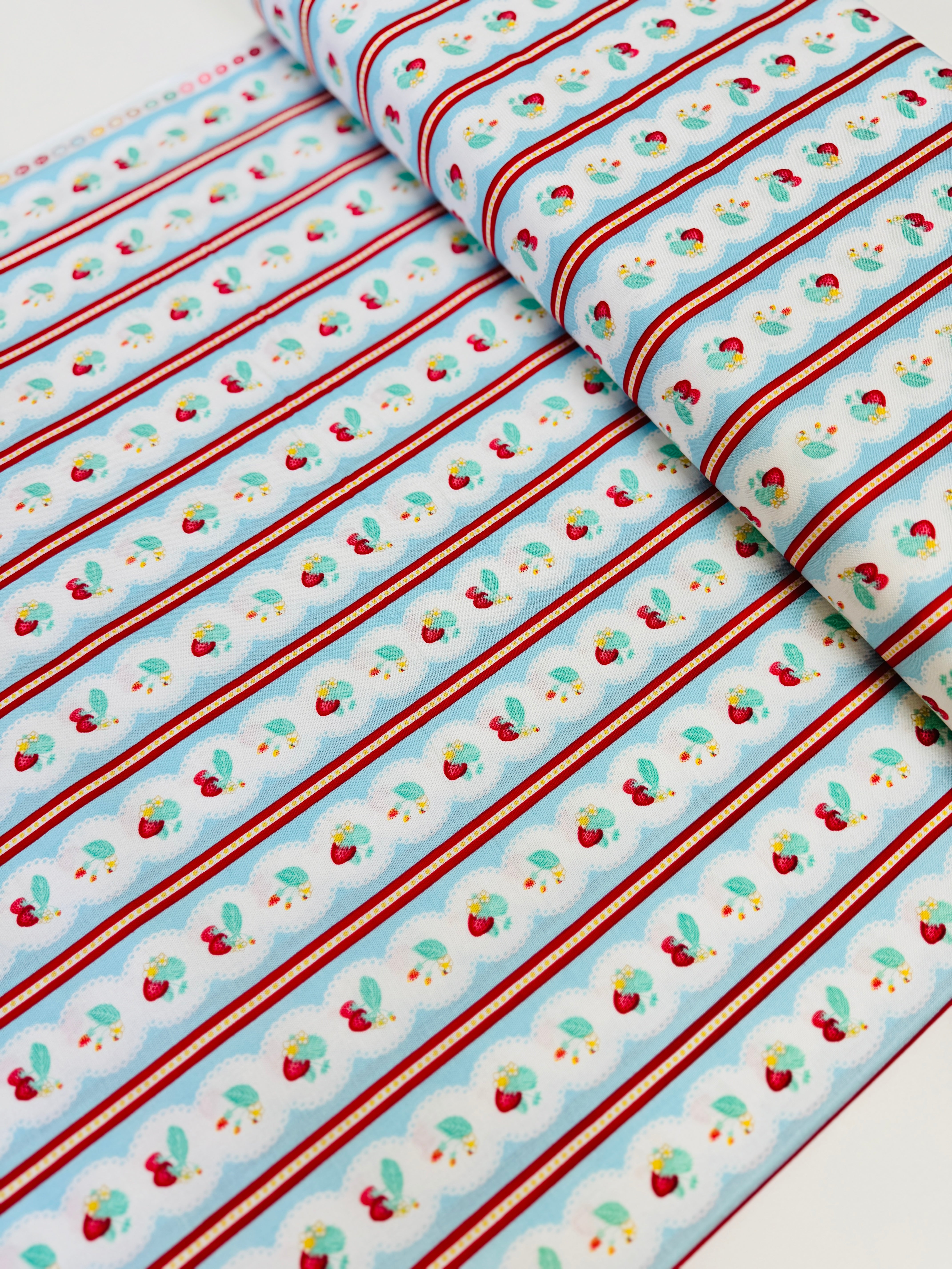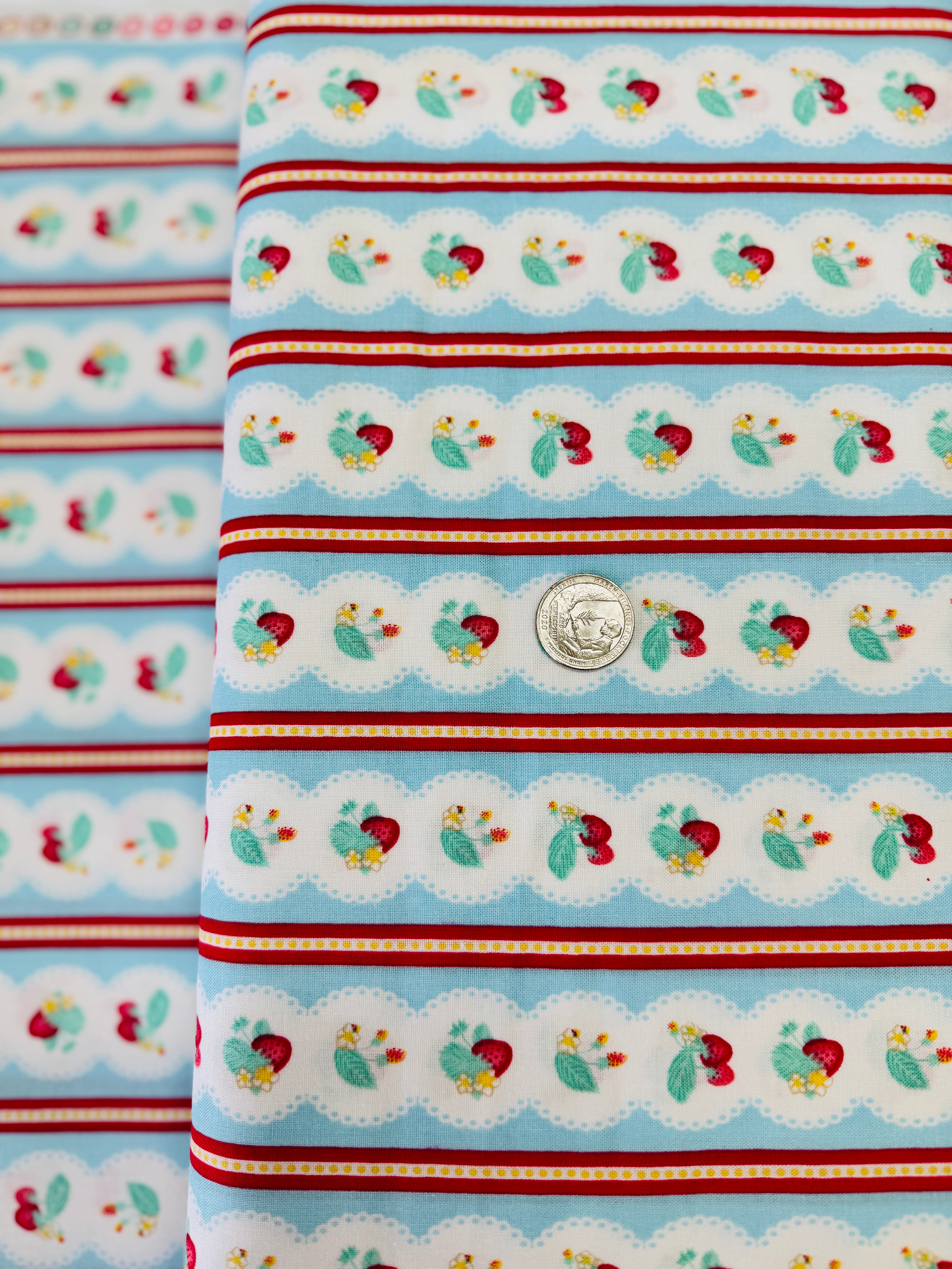 Add a dash of sweet nostalgia to your sewing projects with Strawberry Stripe in Blue from The Shabby Strawberry collection by Emily Hayes for Riley Blake Designs. Featuring darling red strawberries lined up along soft blue and white stripes, this fabric is perfect for vintage-inspired quilts, kids clothing, picnic tablecloths, and more.