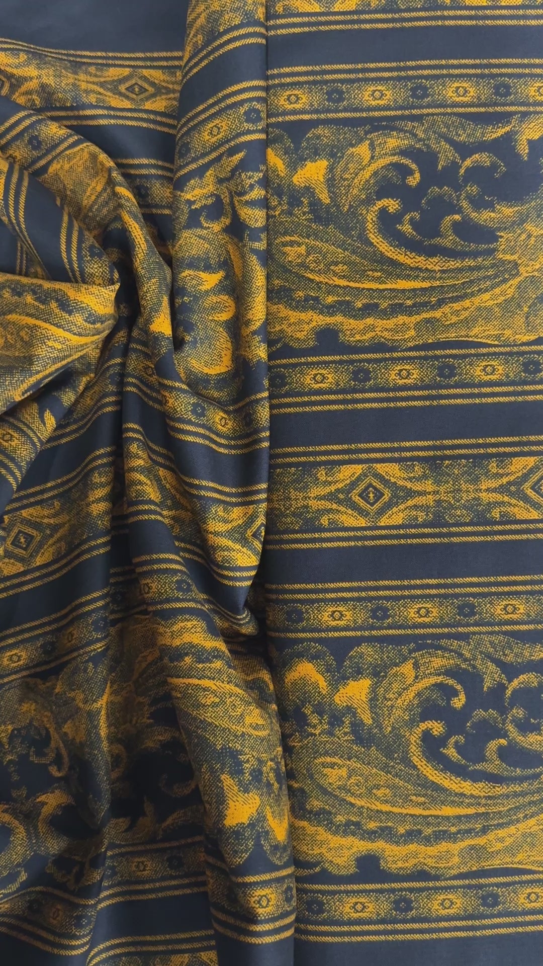 Bring a regal touch to your projects with Border Basics – Gold/Black by Jinny Beyer for RJR Fabrics. This elegant print features ornate border motifs in rich gold on a black background, ideal for framing quilts, creating sashing, or adding statement elements to your sewing work.