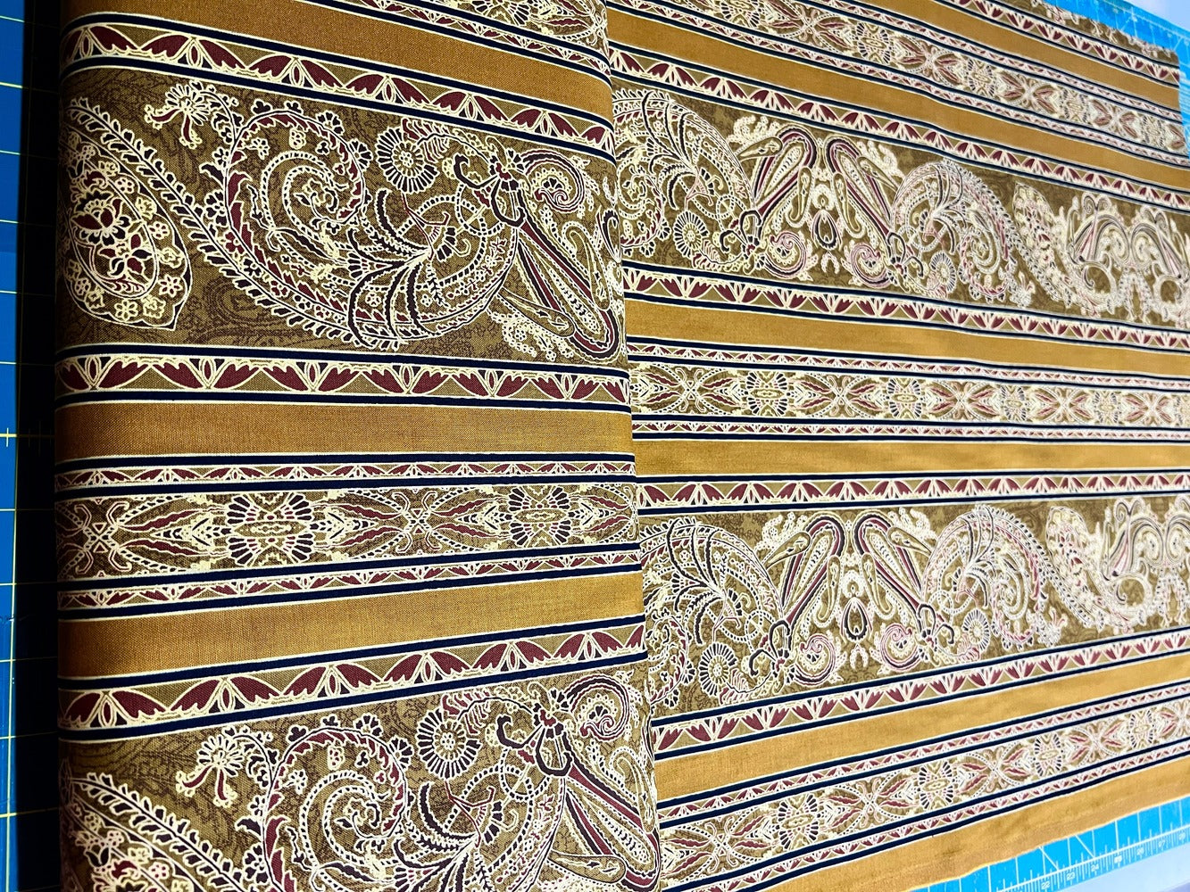 This fabric has 5 big border repeats and 5 small borders repeat across the width of the fabric. The big borders are about 5 inches wide and the small border is about 2 inches wide.