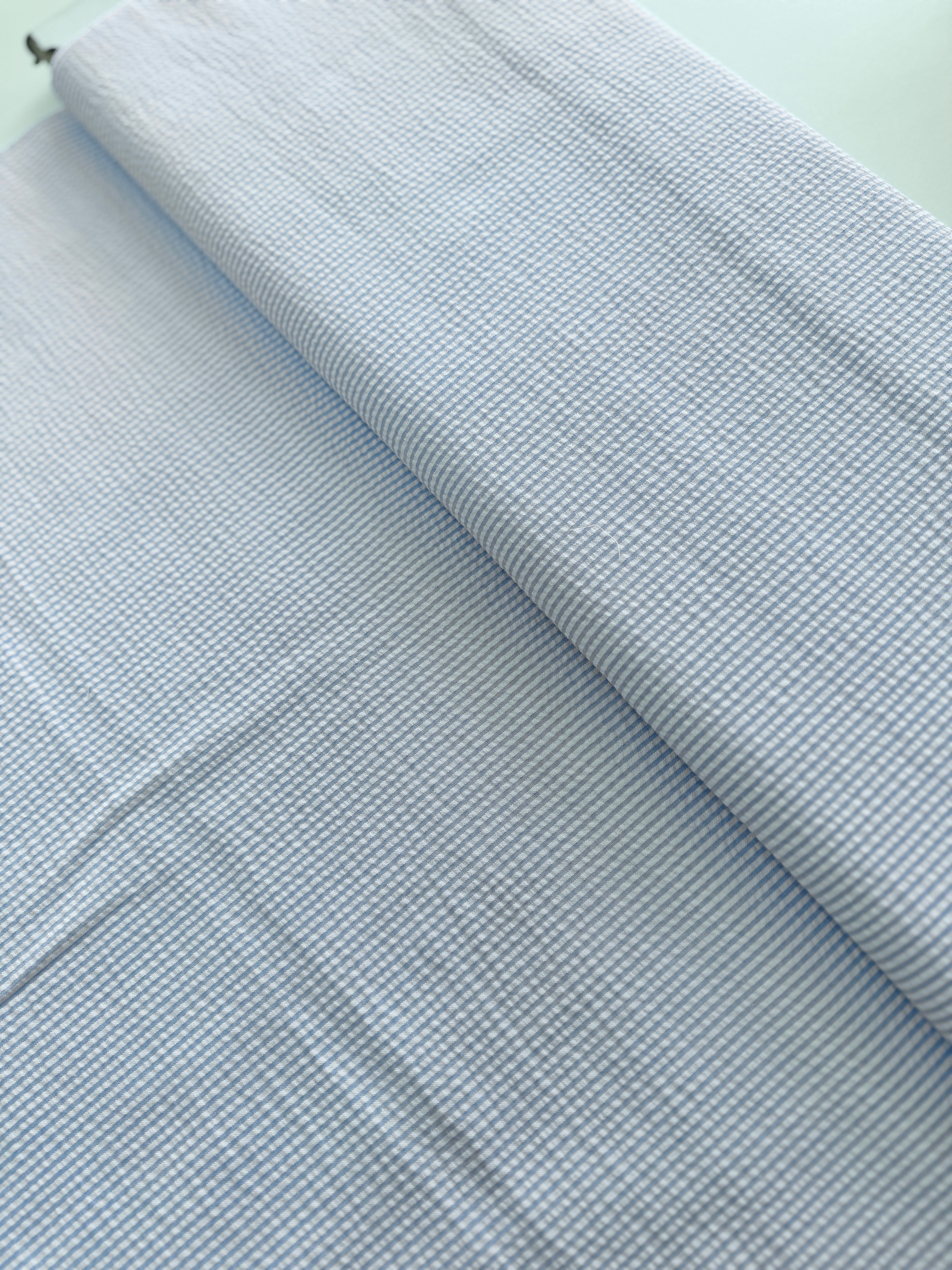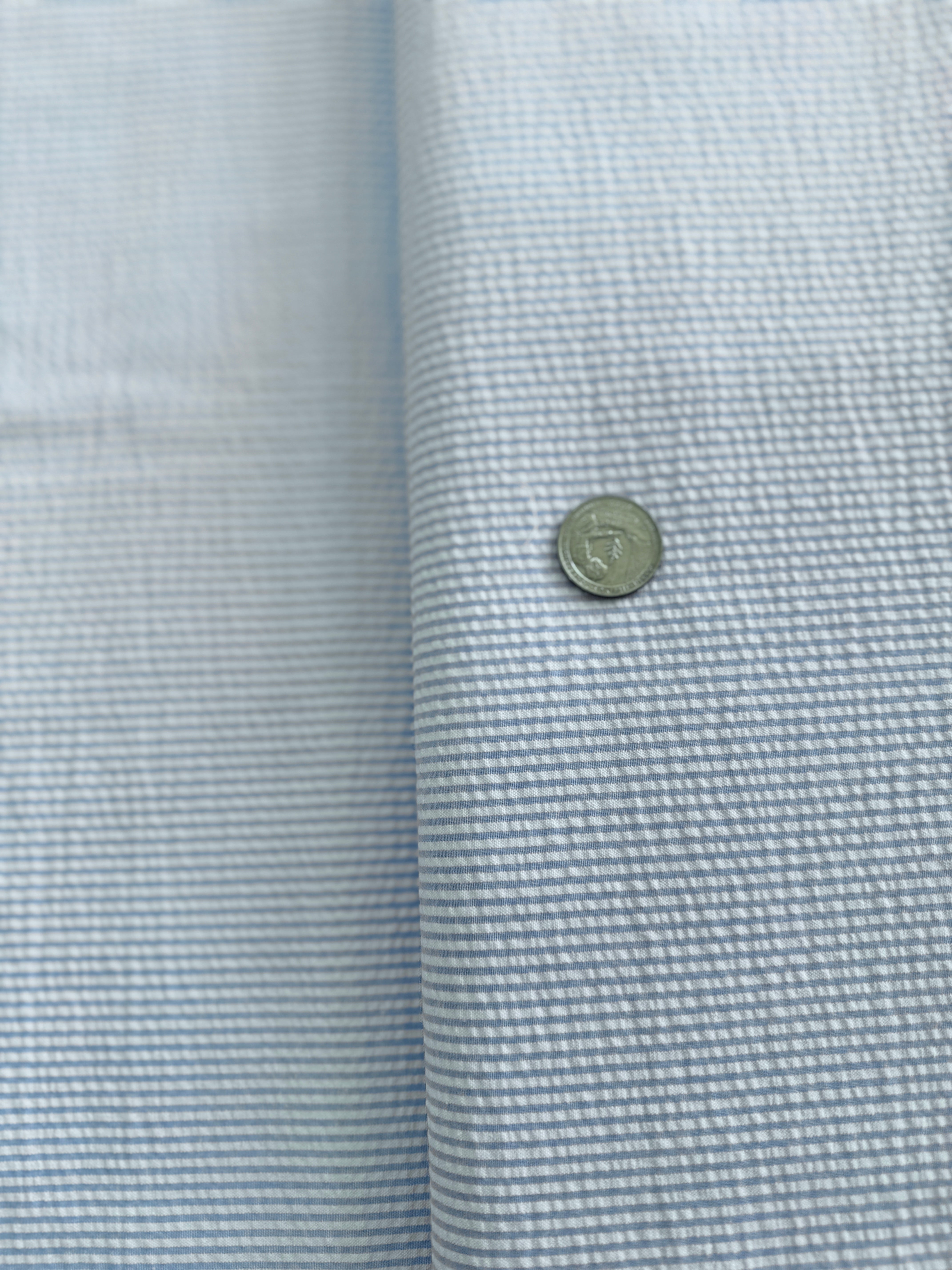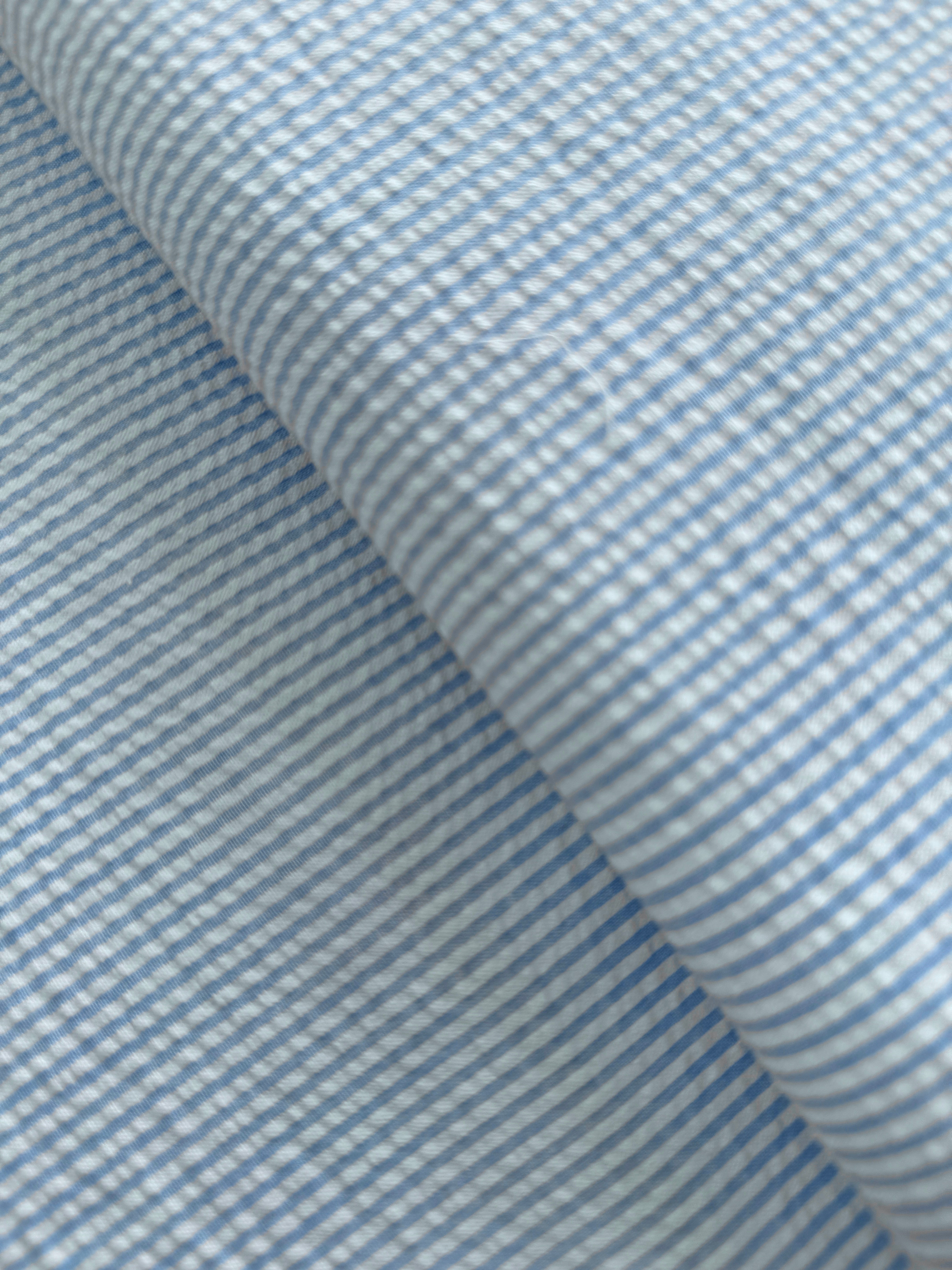 Seersucker Stripe Blue Fabric by Robert Kaufman. This lightweight fabric is perfect for light weight curtains, dresses, summer suits, shorts and apparel.