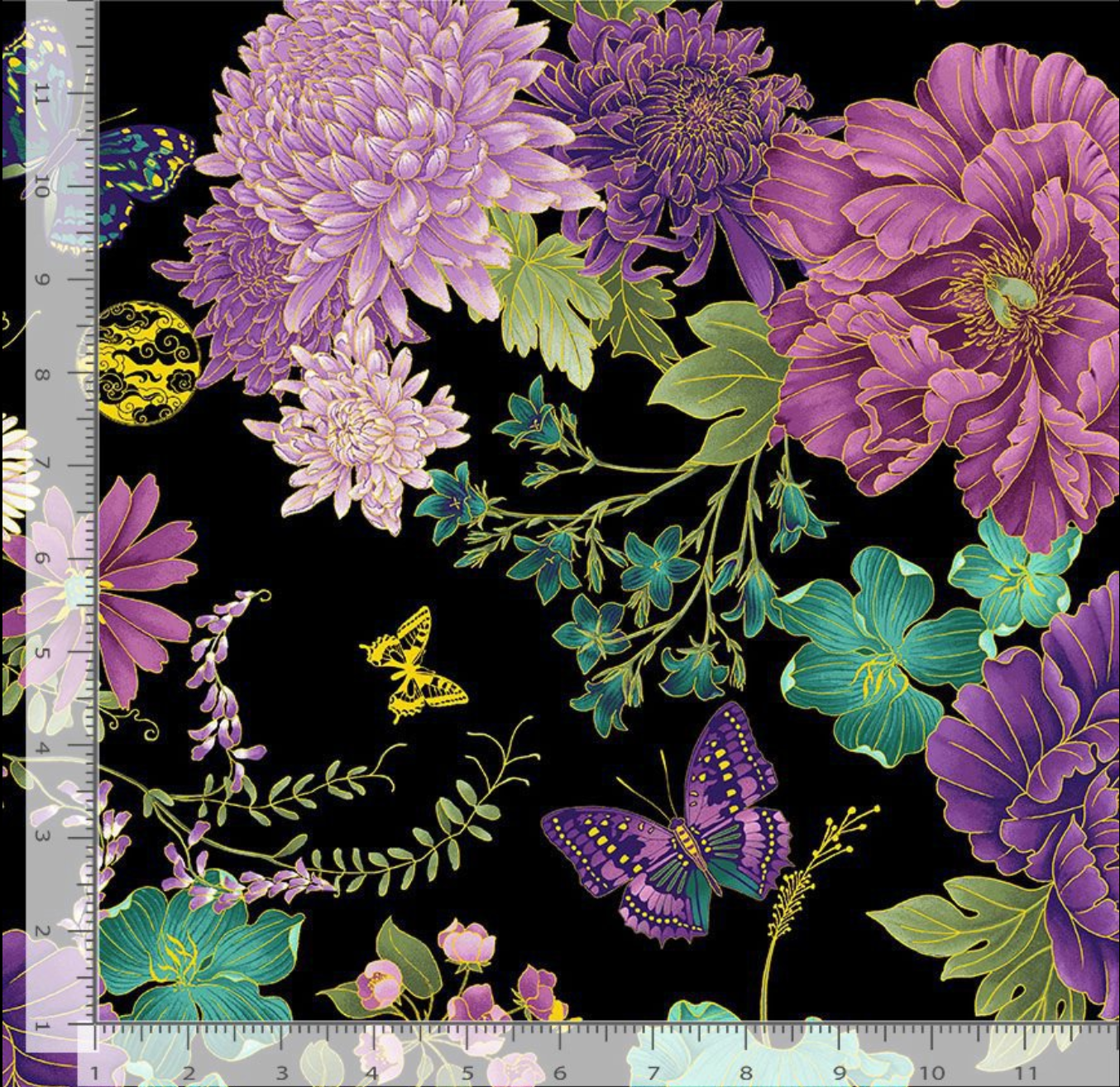 Shizuka – Asian Floral and Butterflies Metallic by Chong-a Hwang for Timeless Treasures showcases exquisite floral motifs and butterflies in a traditional Asian art style. With gold metallic accents, this luxurious 100% cotton fabric is ideal for quilts, apparel, and home décor projects with cultural elegance and a refined sparkle.