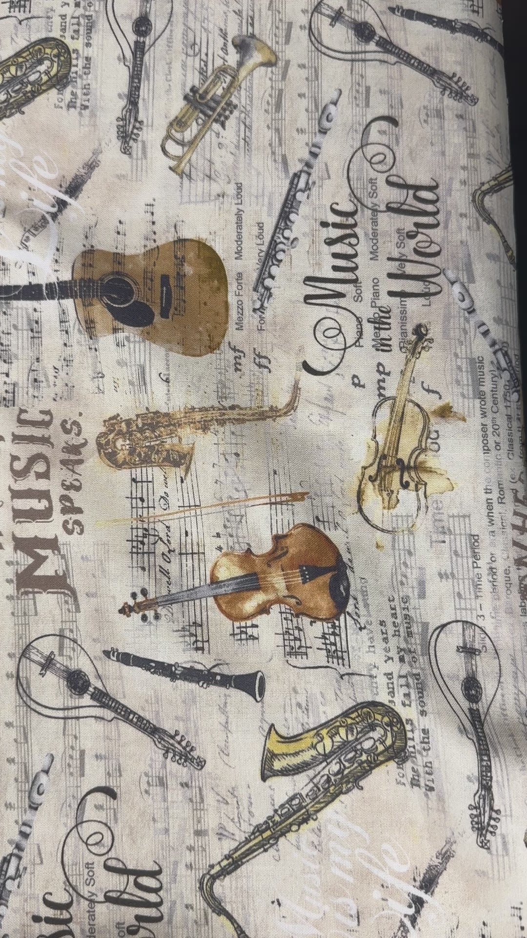 Instruments on Sheet Music Metallic Fabric by Timeless Treasures