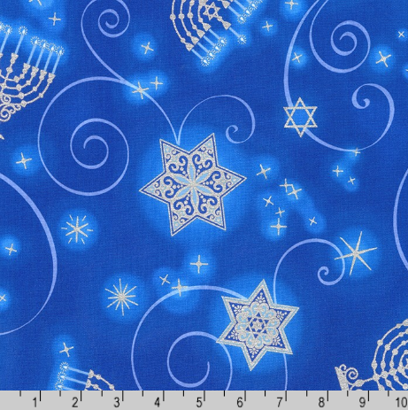 Stars Of Light - Sparkling Menorahs Blue Metallic Yardage