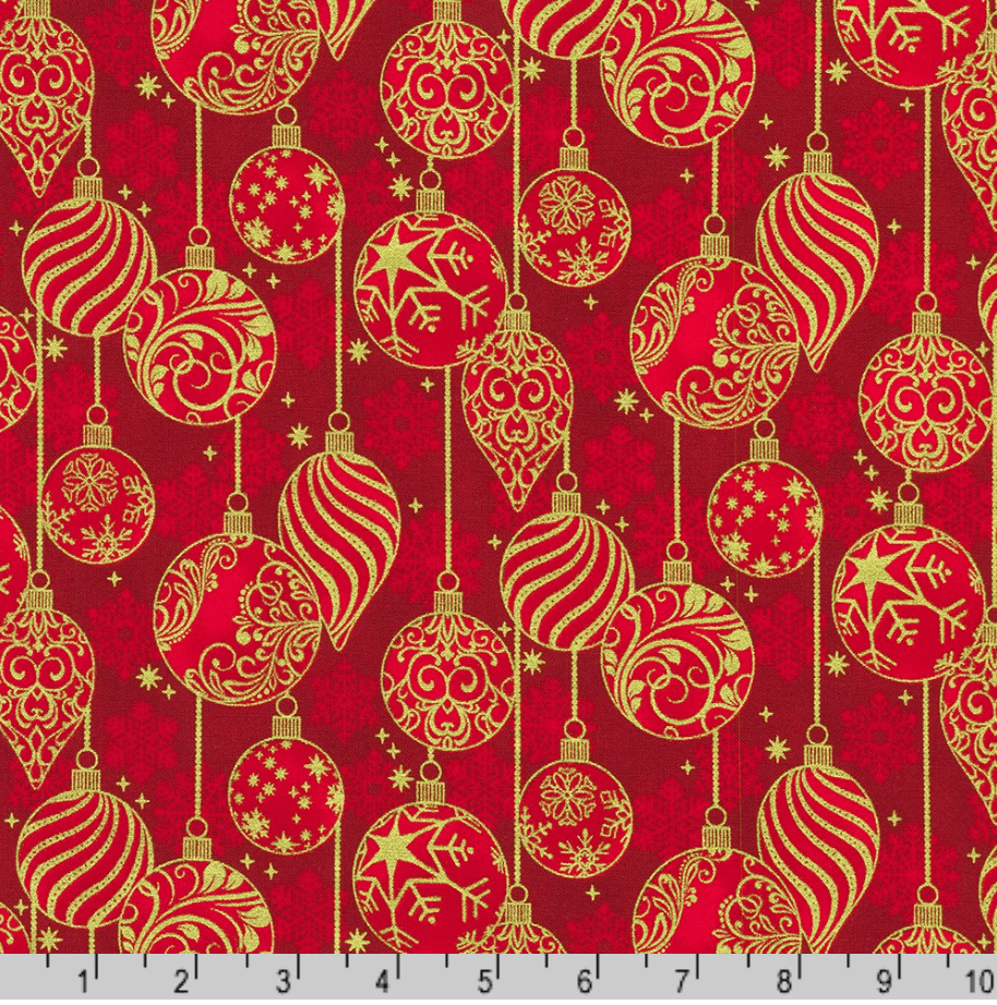 Traditional Trimmings - Gold Ornaments on Crimson Yardage
