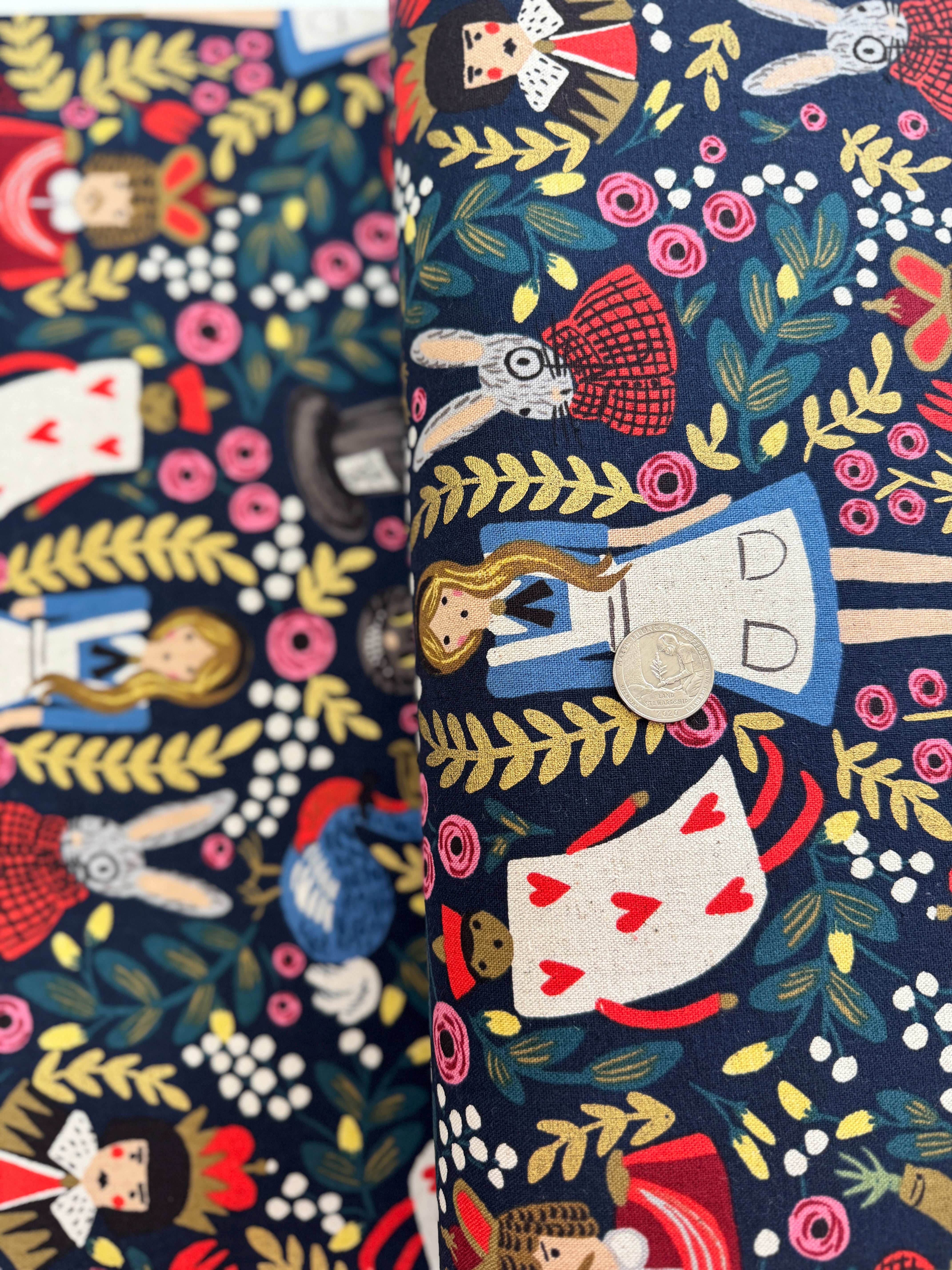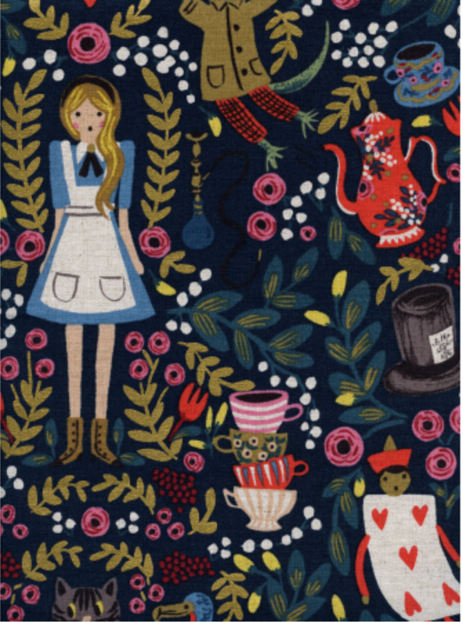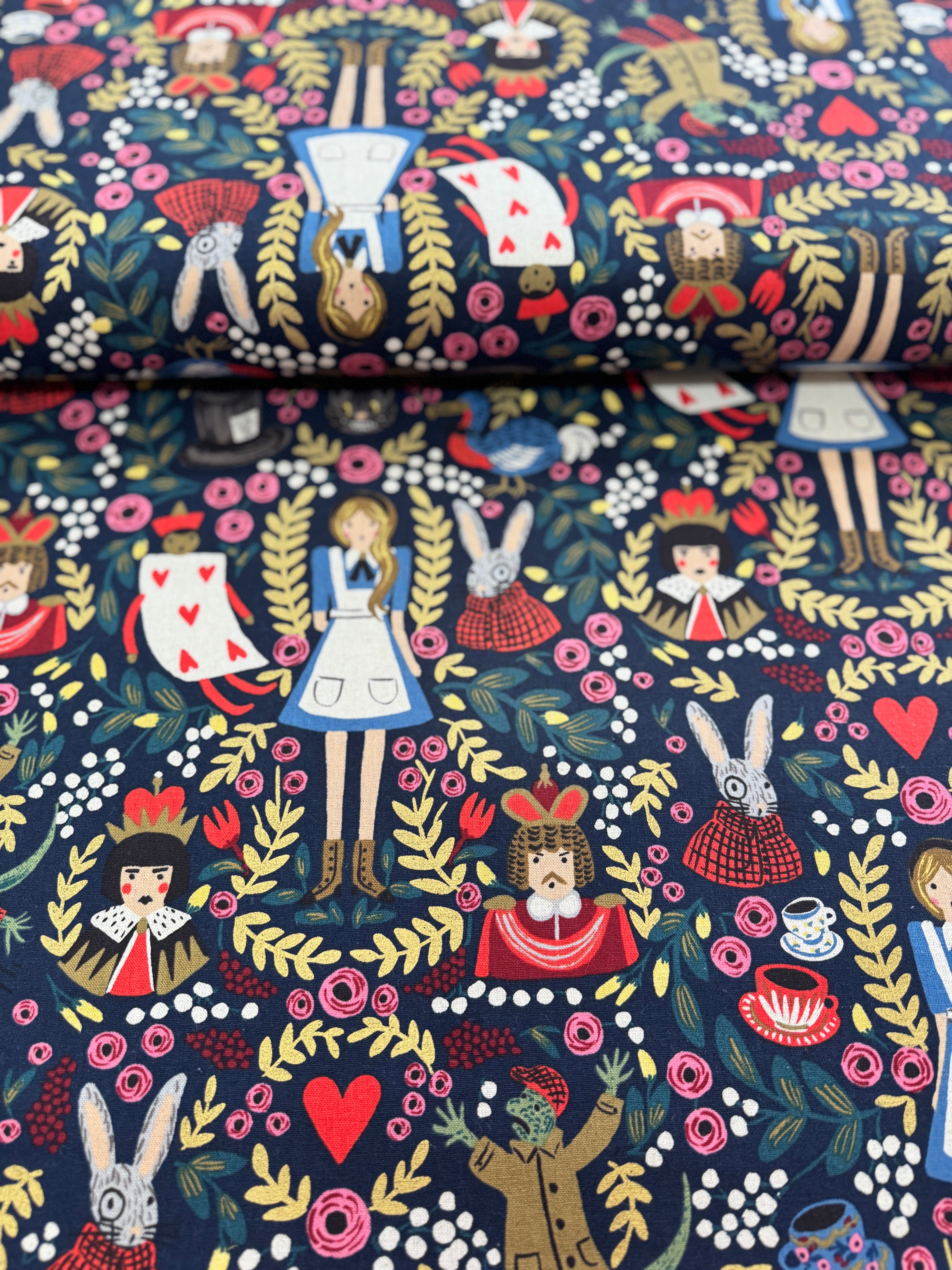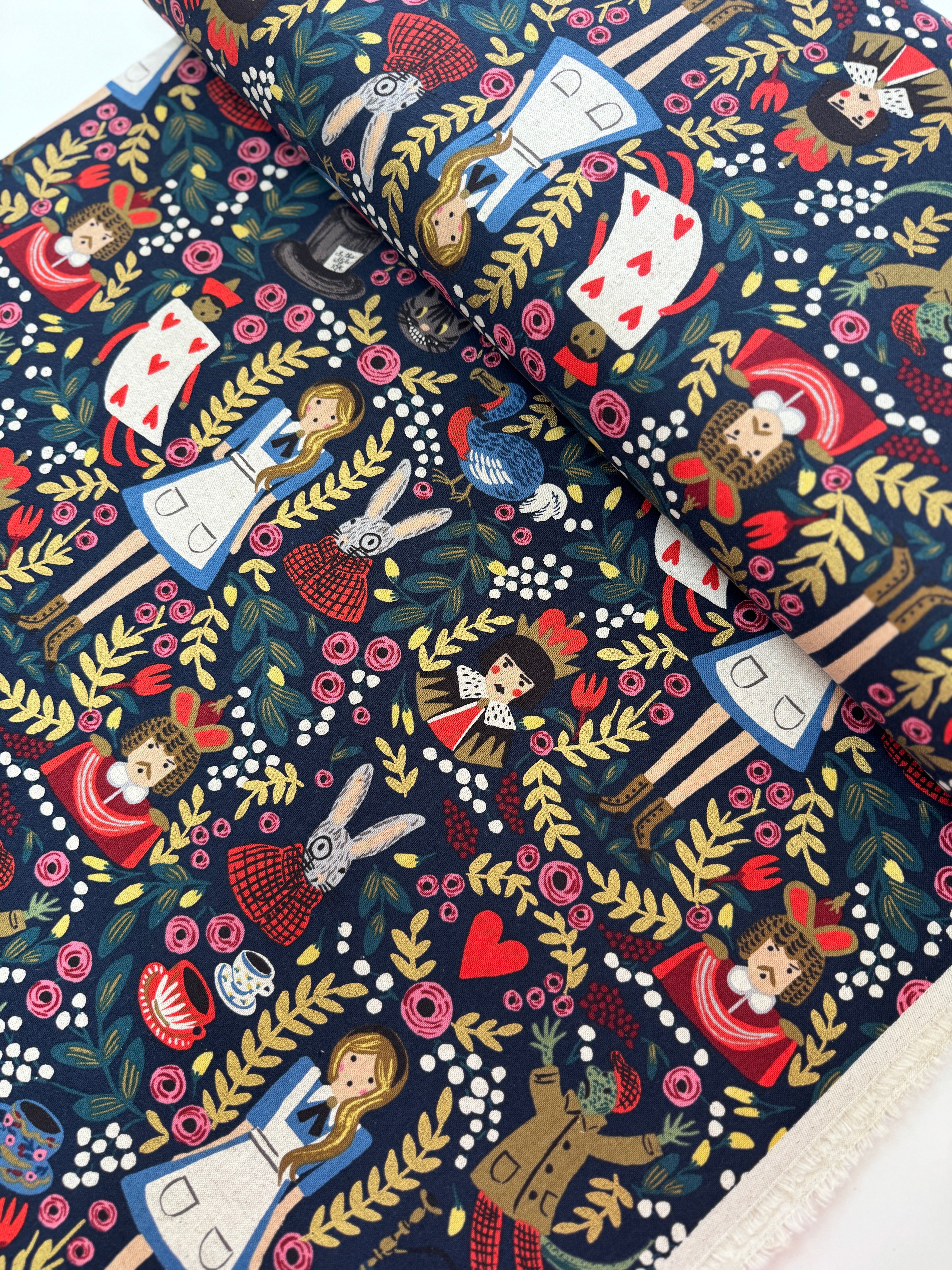 Step into a magical realm with Wonderland – Navy Canvas Metallic by Rifle Paper Co. This whimsical design features enchanted forest elements printed on sturdy cotton-linen canvas, with shimmering metallic gold accents. Perfect for bags, upholstery, pillows, and crafts that need extra charm and durability.
